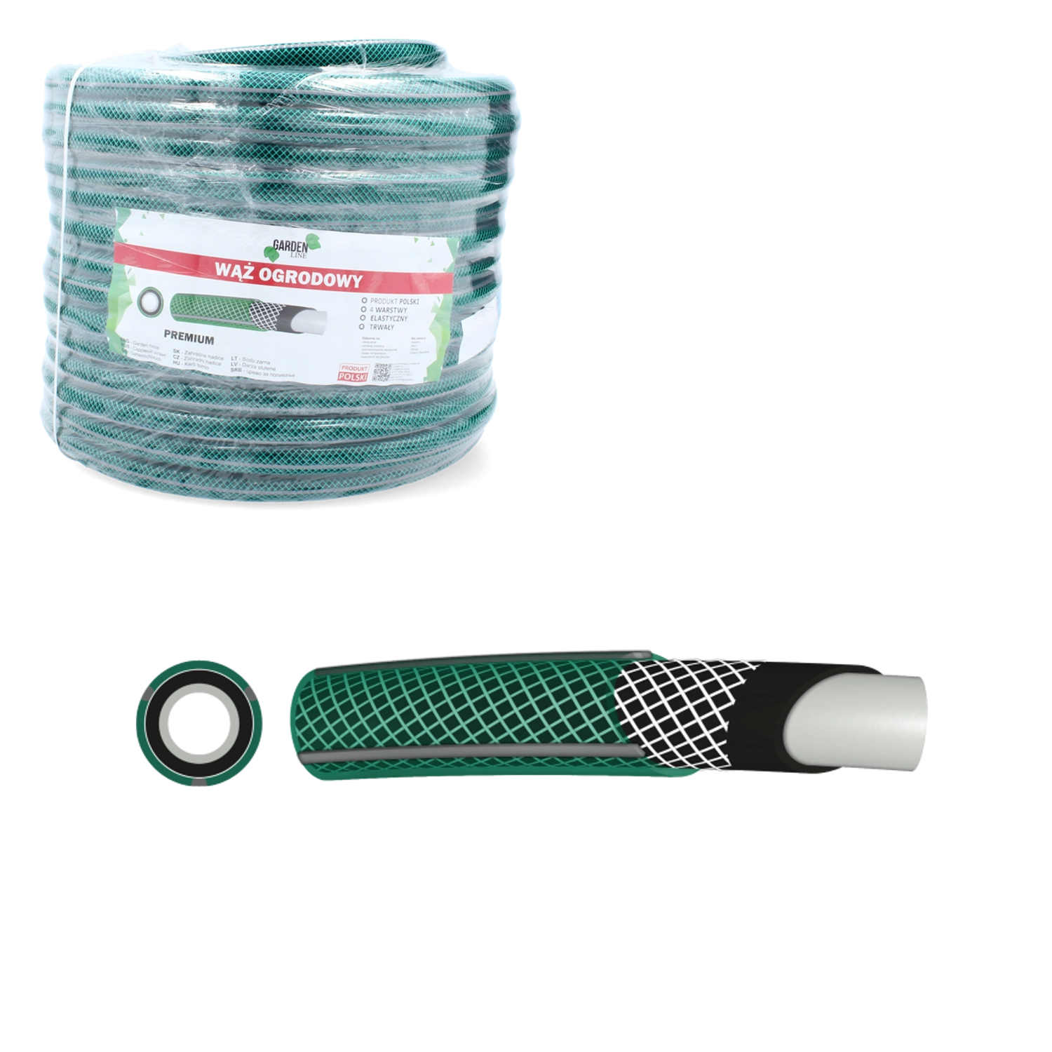 Furtun de grădină Premium durabil, cu lungimea de 20 m și diametrul de 3/4", pentru utilizare intensivă. Construcție în 4 straturi din PVC flexibil cu armătură textilă asigură o rezistență ridicată la deteriorări mecanice. Presiune de lucru 8 bar (20 °C), presiune de spargere >24 bar (20 °C). Funcționare fiabilă în intervalul -10 °C până la +60 °C. Fabricat în Polonia.
