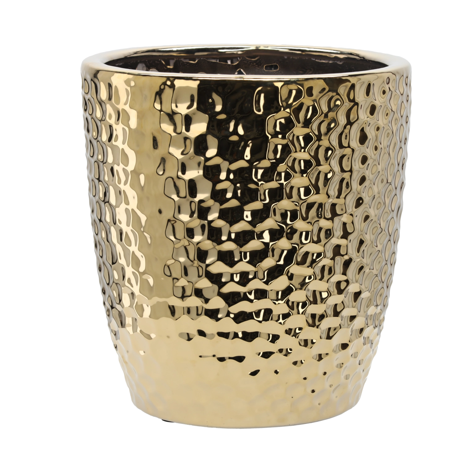 Acest ghiveci decorativ impresionează prin structura unică de hexagoane, care se potrivește perfect atât în interioare moderne, cât și clasice. Finisajul auriu lucios reflectă frumos lumina și creează o impresie premium în living, hol sau birou.