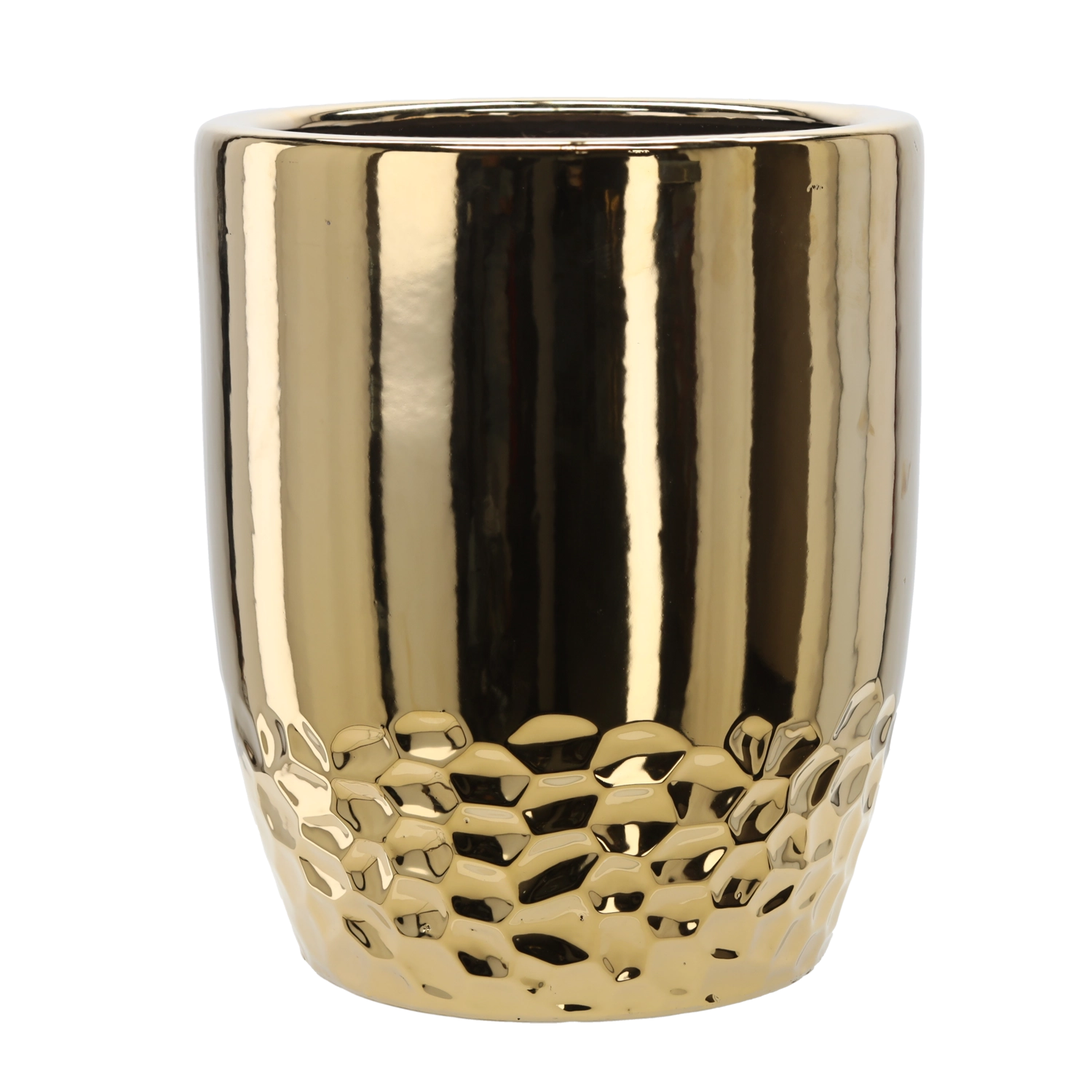 Acest ghiveci modern în finisaj auriu evidențiază perfect verdeața și devine piesa stilată centrală a livingului, holului sau biroului. Structura ceramică rezistentă oferă o stabilitate mai bună plantelor înalte și este ușor de întreținut.