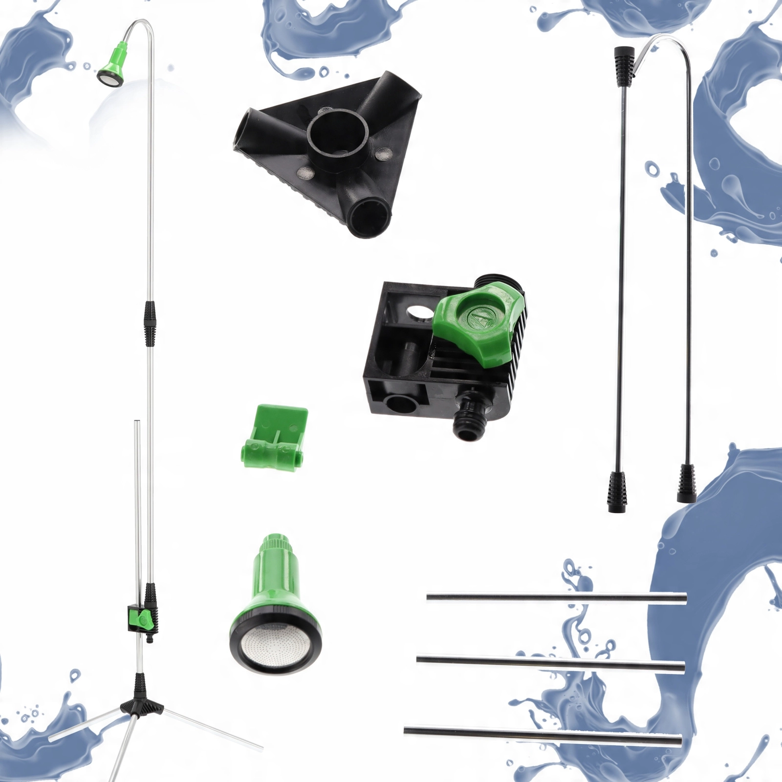 Dușul de grădină pe trepied este o soluție practică pentru zilele toride și pentru o clătire rapidă după munca în grădină. Suportul stabil cu trei picioare asigură poziționarea fermă pe diverse suprafețe, iar reglarea lină a înălțimii adaptează jetul de apă pentru copii și adulți. Conectarea se face într-o clipă – este suficientă o cupă rapidă standard pentru furtunul de grădină.