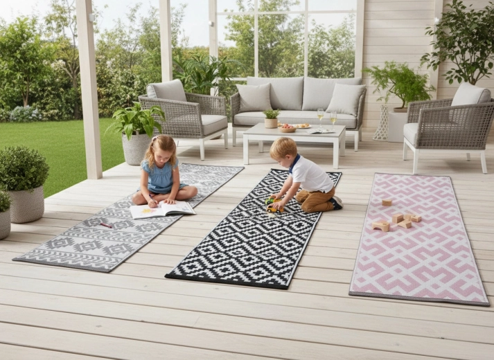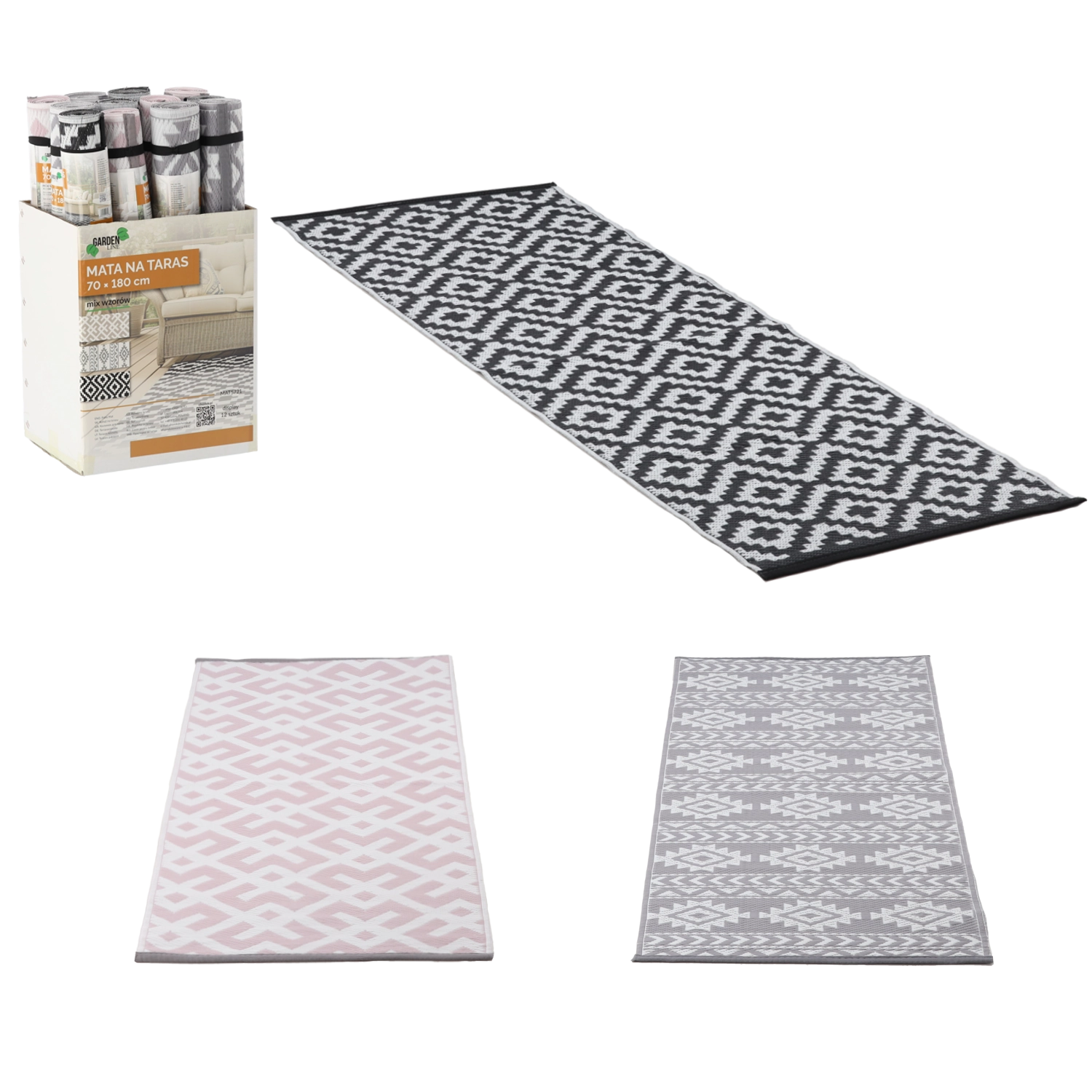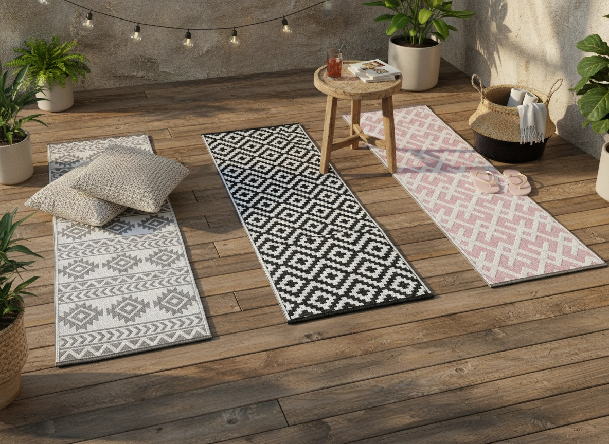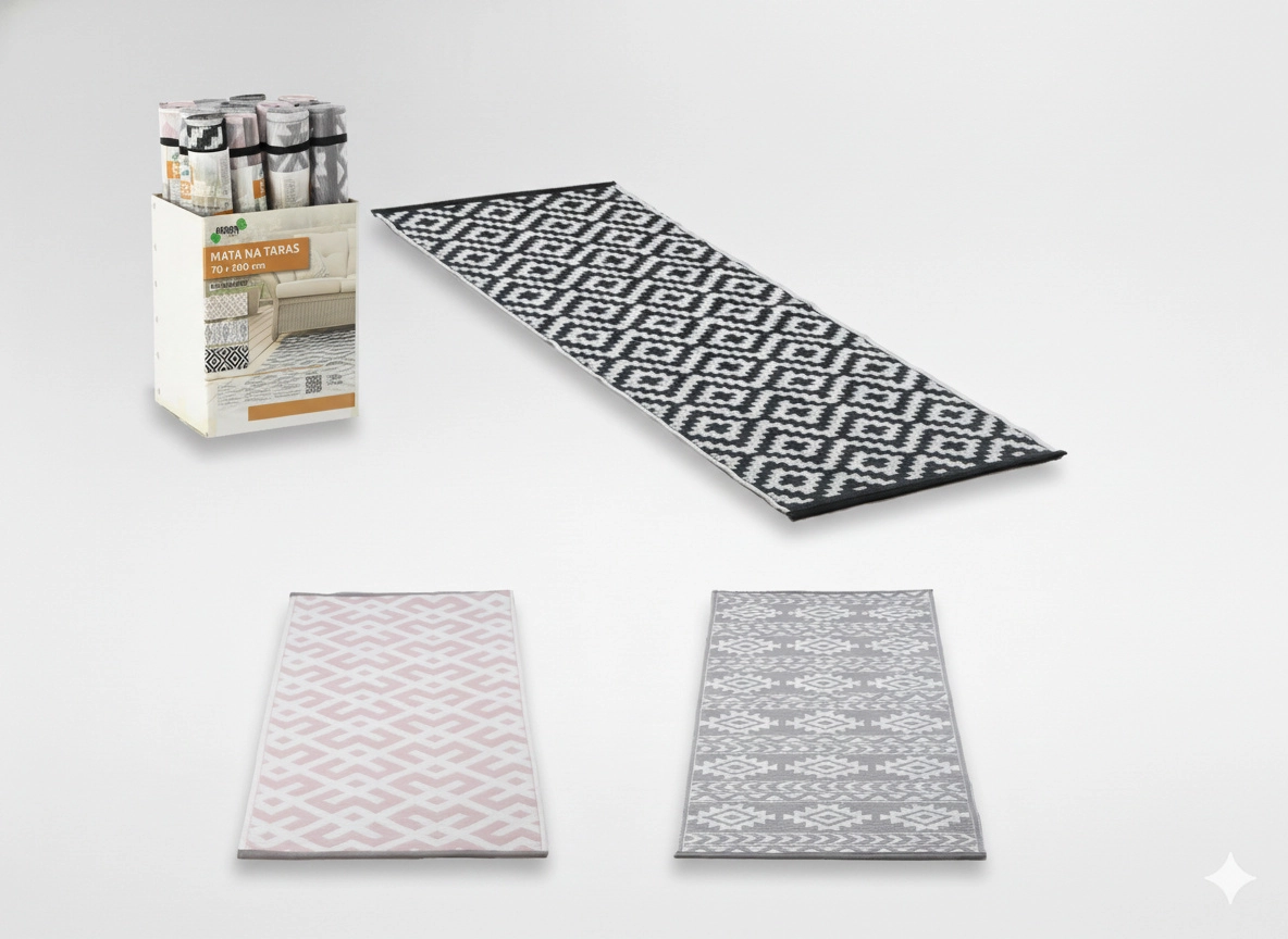 Covorașul/alergătorul practic și decorativ pentru terasă creează o zonă plăcută pentru relaxare și socializare. Întreținerea ușoară și rezistența la umiditate și UV îl fac o alegere ideală pentru exterior, dar și pentru holurile de intrare aglomerate. Dimensiunea universală de 70 × 180 cm este perfectă în fața ușii, lângă setul de grădină sau în pasajele înguste.