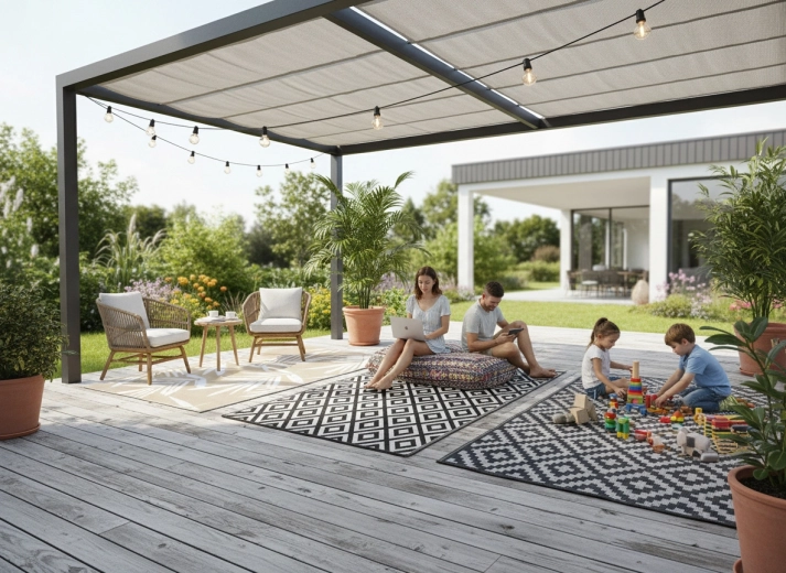 Dimensiunea de 180 × 240 cm acoperă comod suprafața de sub colțarul de exterior sau setul de dining și unifică vizual spațiul.