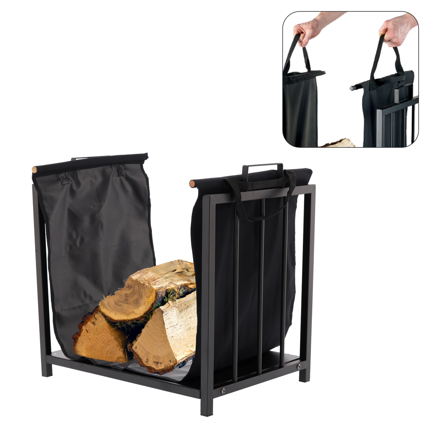 Suport elegant și rezistent pentru lemne de foc, cu geantă practică detașabilă, care asigură ordine lângă șemineu și transport comod al buștenilor. Construcție metalică stabilă, design modern și capacitate de încărcare de până la 25 kg îl fac soluția ideală pentru orice interior cu șemineu, terasă sau cabană.