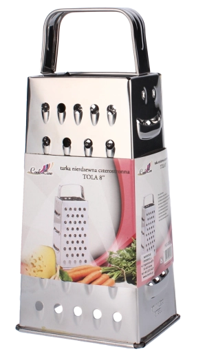 Răzătoare practică cu patru fețe, din oțel inoxidabil de înaltă calitate, cu înălțimea de 21 cm, pentru gătit zilnic. Oferă 4 suprafețe diferite de răzuire pentru răzuire fină și grosieră, tăiere și feliere. Inoxul durabil asigură o durată lungă de viață, iar mânerul ergonomic oferă prindere comodă și sigură.