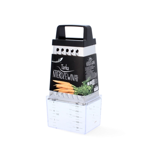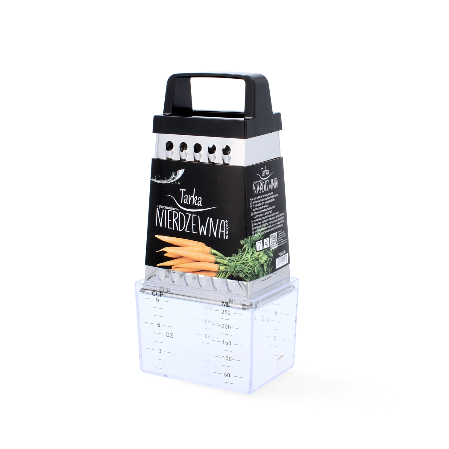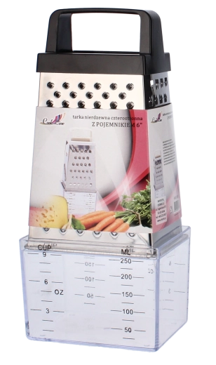 Răzătoare de bucătărie practică din oțel inoxidabil, cu recipient atașat pentru lucru curat și comod. Oferă 4 fețe de răzuire – fină, grosieră, feliere și extra fină. Datorită mânerului ergonomic se ține excelent în mână, iar oțelul inoxidabil durabil asigură o durată de viață îndelungată.