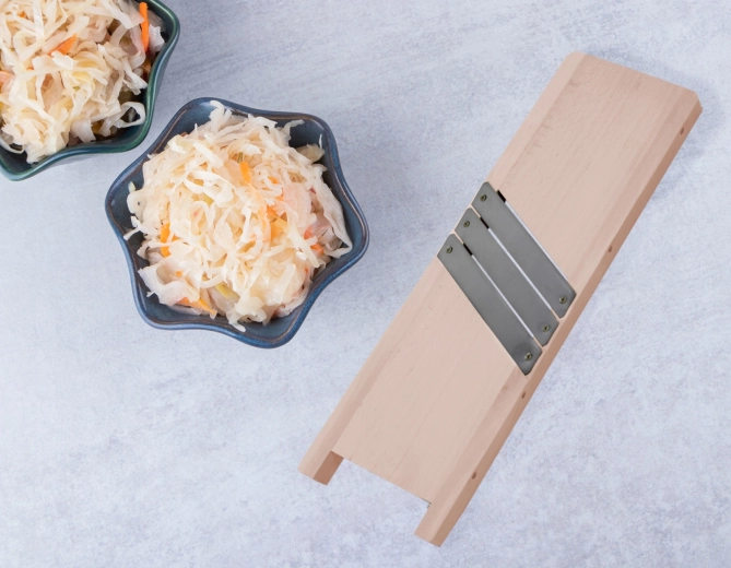 Această răzătoare/mandolină din lemn cu trei lame ascuțite din inox este ideală pentru prepararea verzei murate de casă, a salatelor și a felilor fine de legume. Datorită lamelor montate oblic, taie ingredientele uniform și cu efort minim. Dimensiunile compacte de 44 × 15 cm facilitează manevrarea și depozitarea.