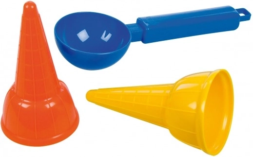 Acest set colorat de înghețată transformă orice nisipar într-o mică cofetărie. Copiii pot lua nisip sau apă, pot crea „cupe de înghețată” și le pot servi în cornete. Construcția ușoară și rezistentă asigură utilizare confortabilă și durată lungă de viață.