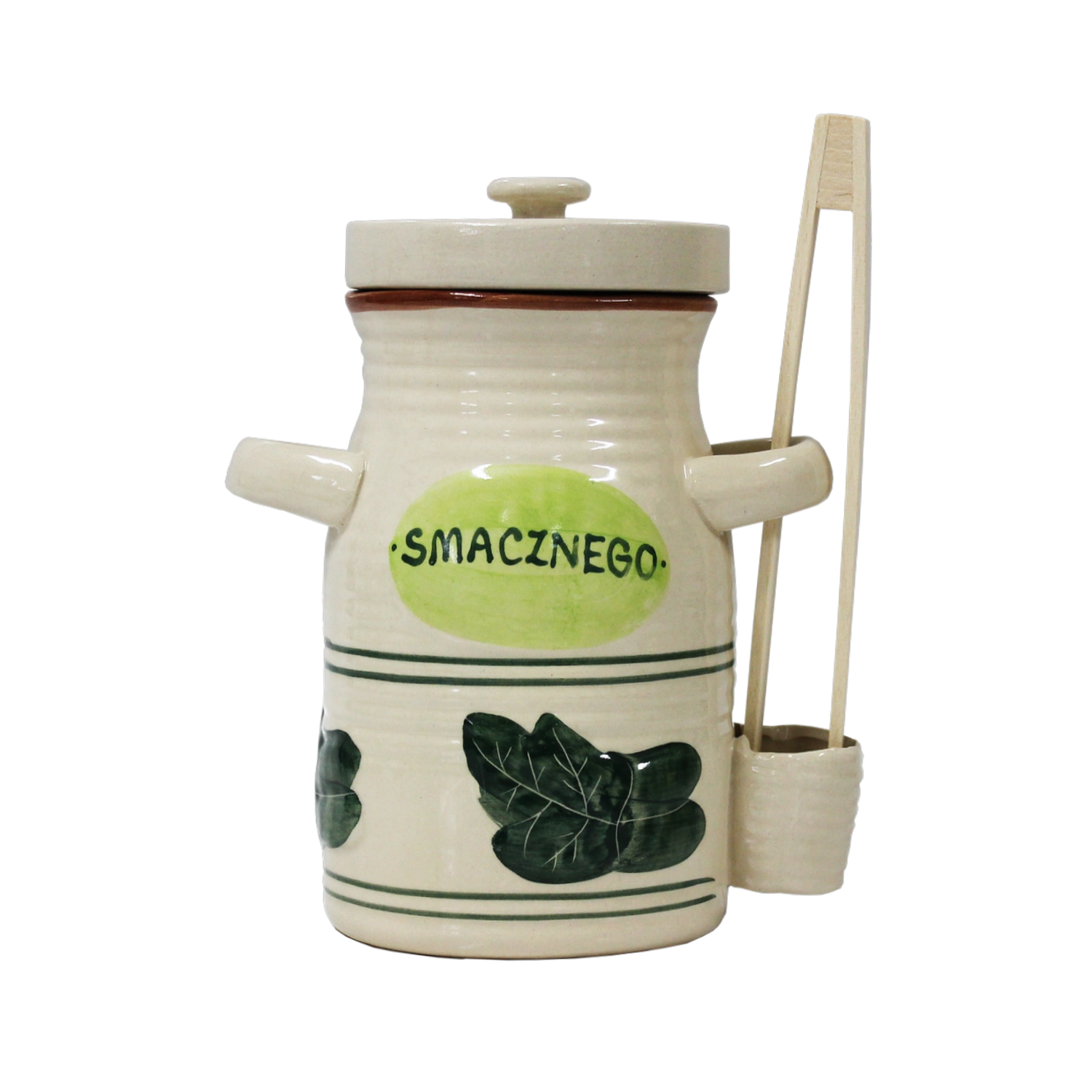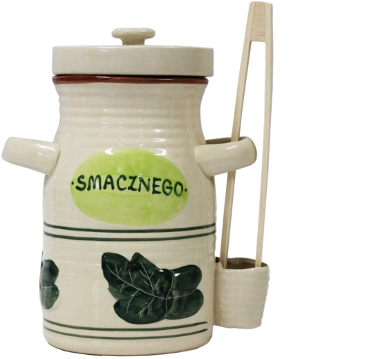 Vas ceramic practic cu volum de 3,5 l, ideal pentru murături și fermentarea alimentelor de casă. Ceramica de calitate este netoxică, rezistentă la acizi și nu influențează gustul. Include capac ceramic și clești din lemn de 22 cm pentru scoatere comodă. Buzunar lateral integrat pentru clești și decor cu inscripția „Smacznego” oferă un plus practic și estetic.