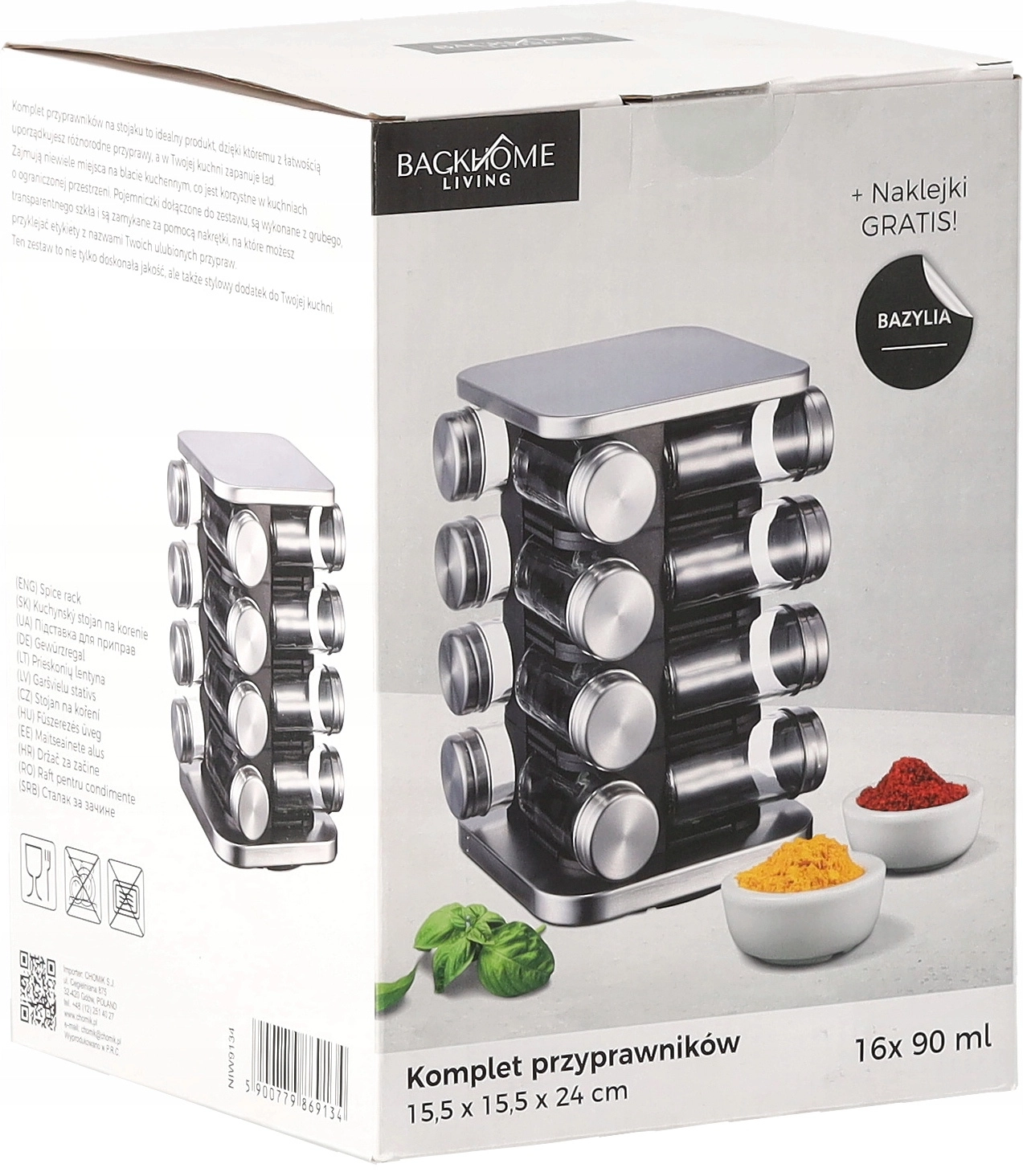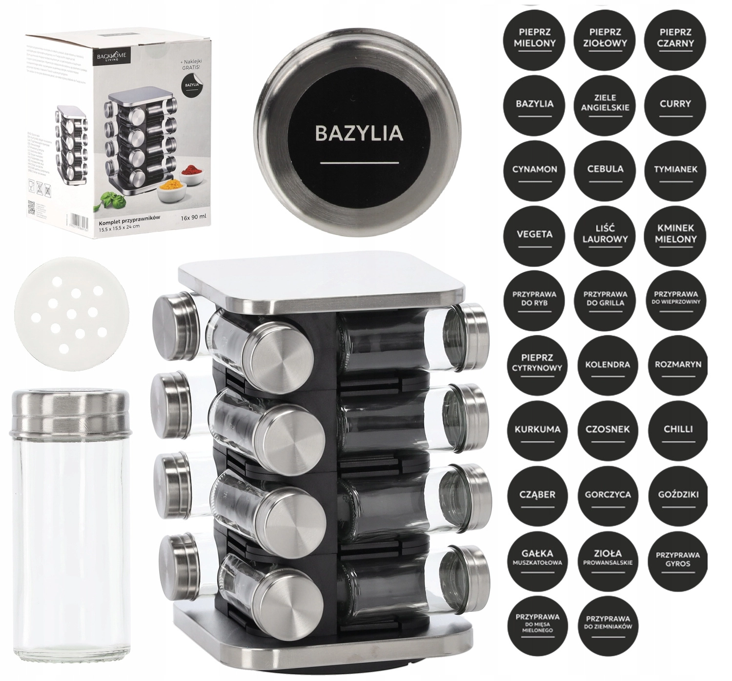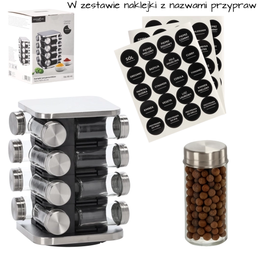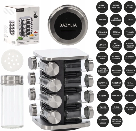 Elegantul suport pătrat pentru condimente, cu dimensiuni de 15,5 × 15,5 × 24 cm, oferă depozitare clară și acces rapid la condimentele preferate. Include 16 borcane transparente din sticlă cu capace din oțel cu filet și o construcție rotativă practică pentru utilizare comodă. Pachetul conține o set de 38 autocolante pentru etichetarea ușoară a borcanelor.