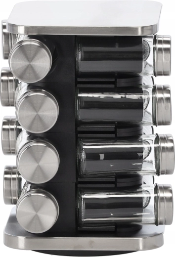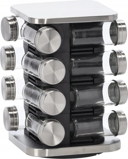 Păstrați ordinea în bucătărie și aveți condimentele mereu la îndemână. Acest organizator rotativ pentru condimente îmbină aspectul modern negru‑argintiu cu o funcționalitate bine gândită. Baza compactă economisește spațiu pe blatul de lucru, iar aranjarea pătrată în 4 coloane a câte 4 borcane permite orientare rapidă.