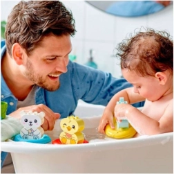 Transformați fiecare baie într-o distracție sigură și stimulantă. Animăluțele colorate pe inele frumos rotunjite, plutitoare pot fi ușor conectate de către copii într-un trenuleț, trase pe suprafața apei și urmărite cum fac băluțe. Piesele sunt concepute pentru mâini mici, iar pentru că inelele se deschid, curățarea este rapidă și igienică.