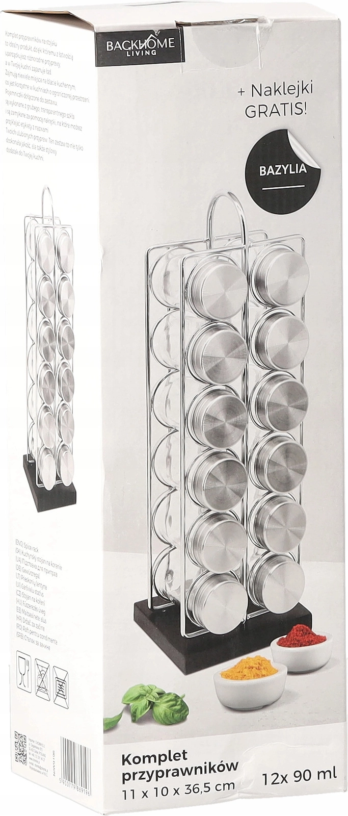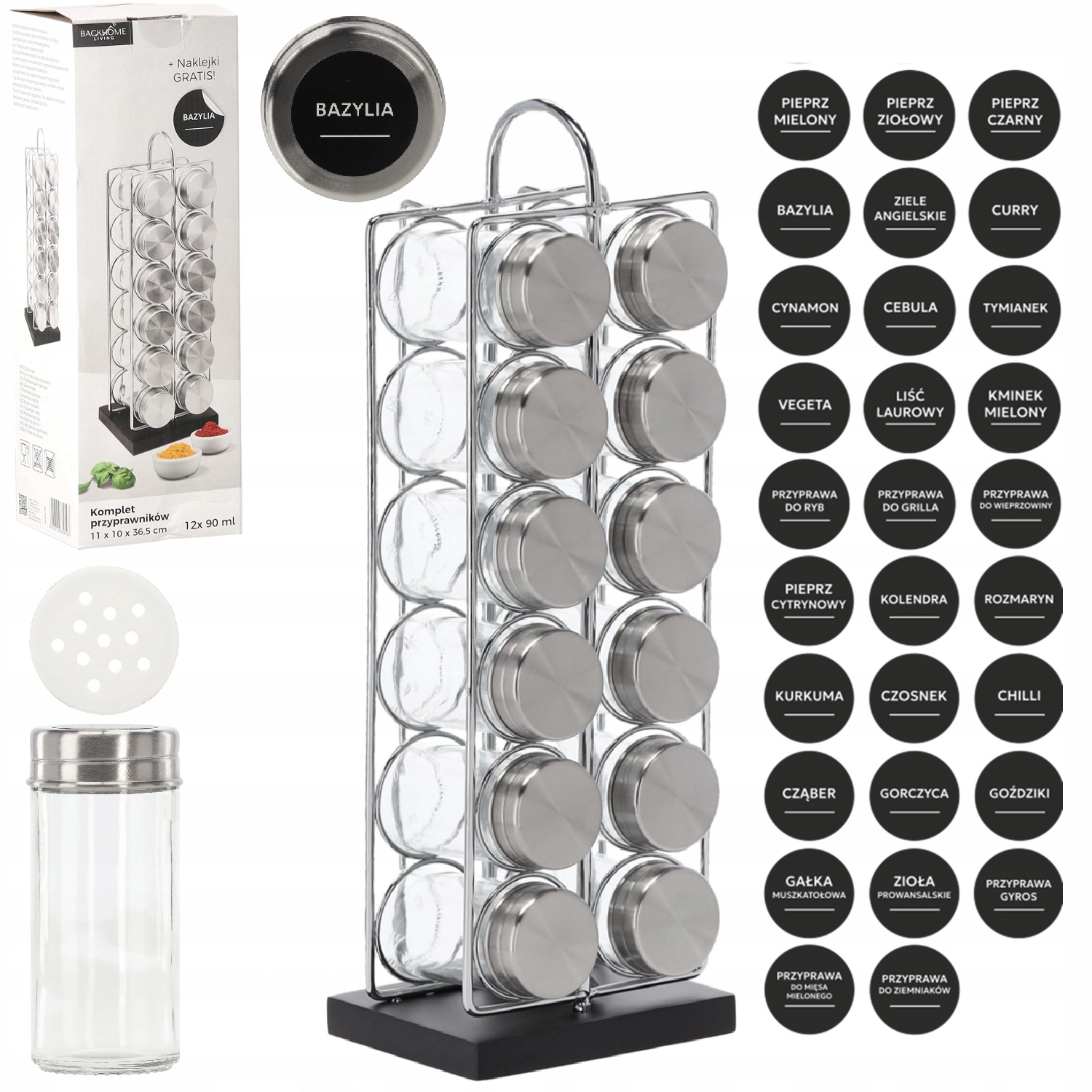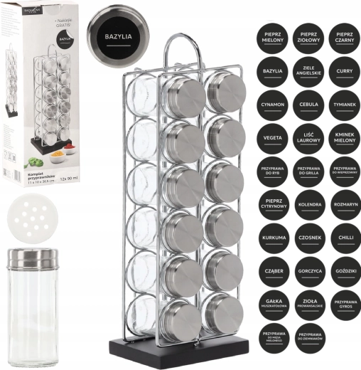 În pachet găsești 12 borcane transparente din sticlă cu volum de 90 ml și capace din inox cu filet, care mențin aroma și prospețimea condimentelor. Dispunerea practică în 2 coloane a câte 6 facilitează identificarea rapidă și economisește spațiu pe blat.