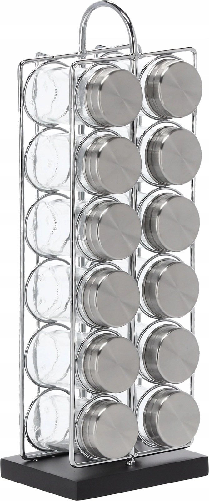 Organizează condimentele inteligent și cu stil. Acest suport combină un cadru din oțel durabil cu o bază elegantă neagră din MDF, integrându-se perfect atât în bucătării moderne, cât și clasice. Datorită mânerului comod, muți ușor suportul acolo unde gătești.