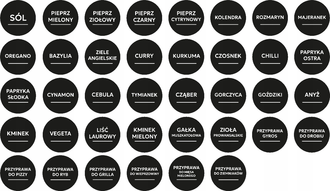 Sunt incluse și o set de 38 etichete cu cele mai frecvente denumiri de condimente (de ex. sare, piper, oregano, busuioc, curry, turmeric, boia dulce/iute, scorțișoară, usturoi, cimbru etc.), pentru o personalizare ușoară și o organizare impecabilă.