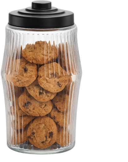 Borcan practic cu volum de 3,8 l, cu design striat elegant și capac metalic negru pentru închidere sigură și etanșă. Ideal pentru miere, gemuri, condimente și alte alimente. Aspectul atemporal se potrivește perfect în orice bucătărie sau cămară și poate servi și ca element decorativ.