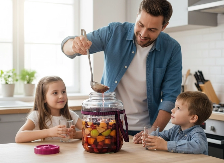 Pregătiți dintr-o singură tură loturi mai mari de vin de casă, limonade, musturi sau legume murate. Sticla transparentă facilitează controlul conținutului și al procesului.
