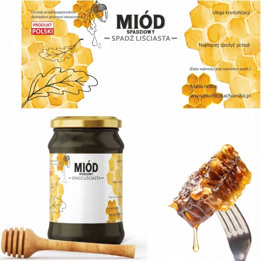 Etichetele sunt concepute pentru miere de mană – spad din foioase, astfel încât clientul să recunoască ușor tipul de miere dintr-o privire. Datorită spațiului pentru data durabilității minimale, veți îndeplini cerințele de etichetare a alimentelor și, în același timp, veți menține un aspect profesionist.