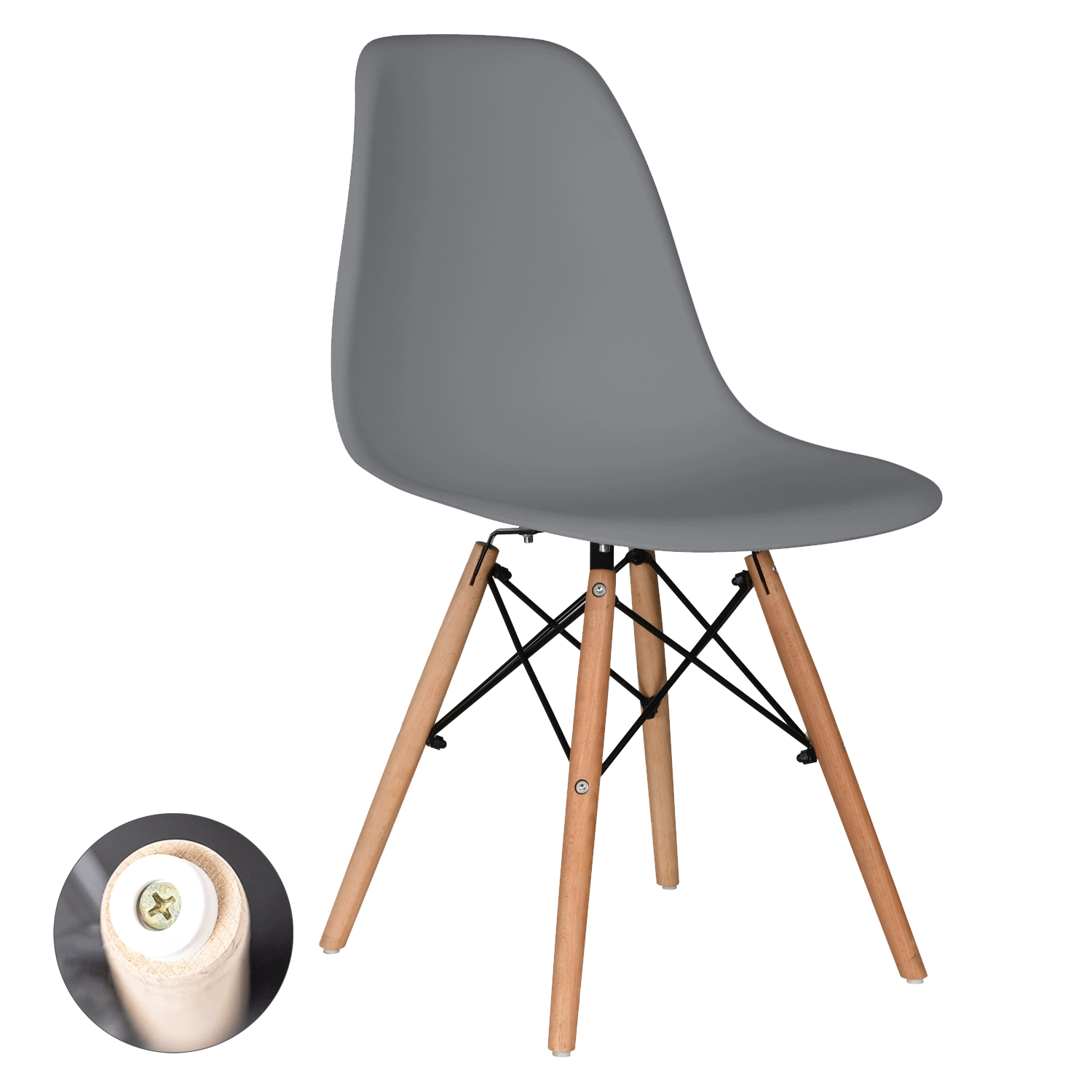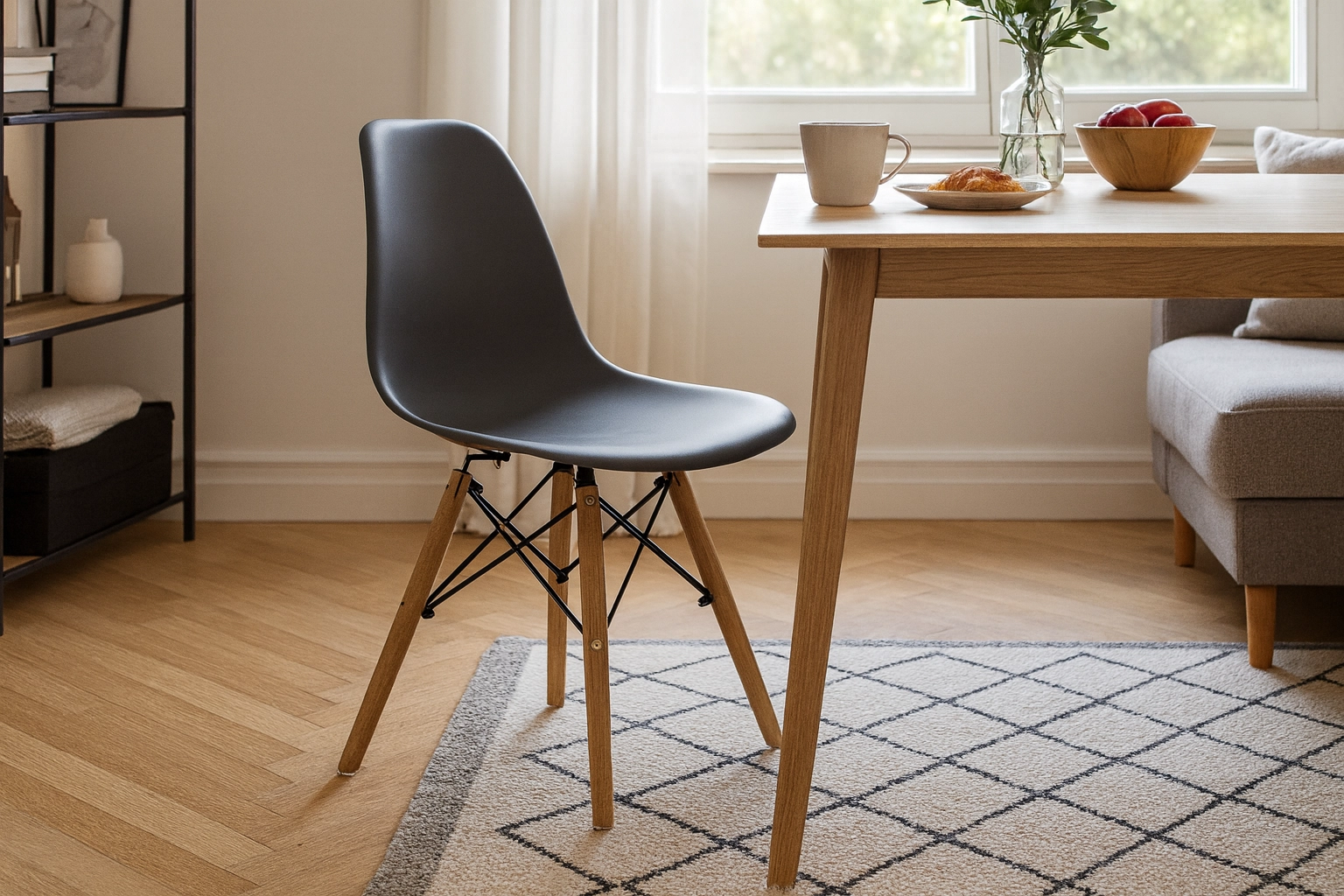 Scaunul gri elegant, cu șezut din plastic profilat, oferă confort pentru utilizarea zilnică și un aspect atemporal pentru orice interior – de la stil scandinav la loft modern. Picioarele din fag în nuanță caldă și întăriturile metalice negre adaugă stabilitate și un contrast vizual plăcut.