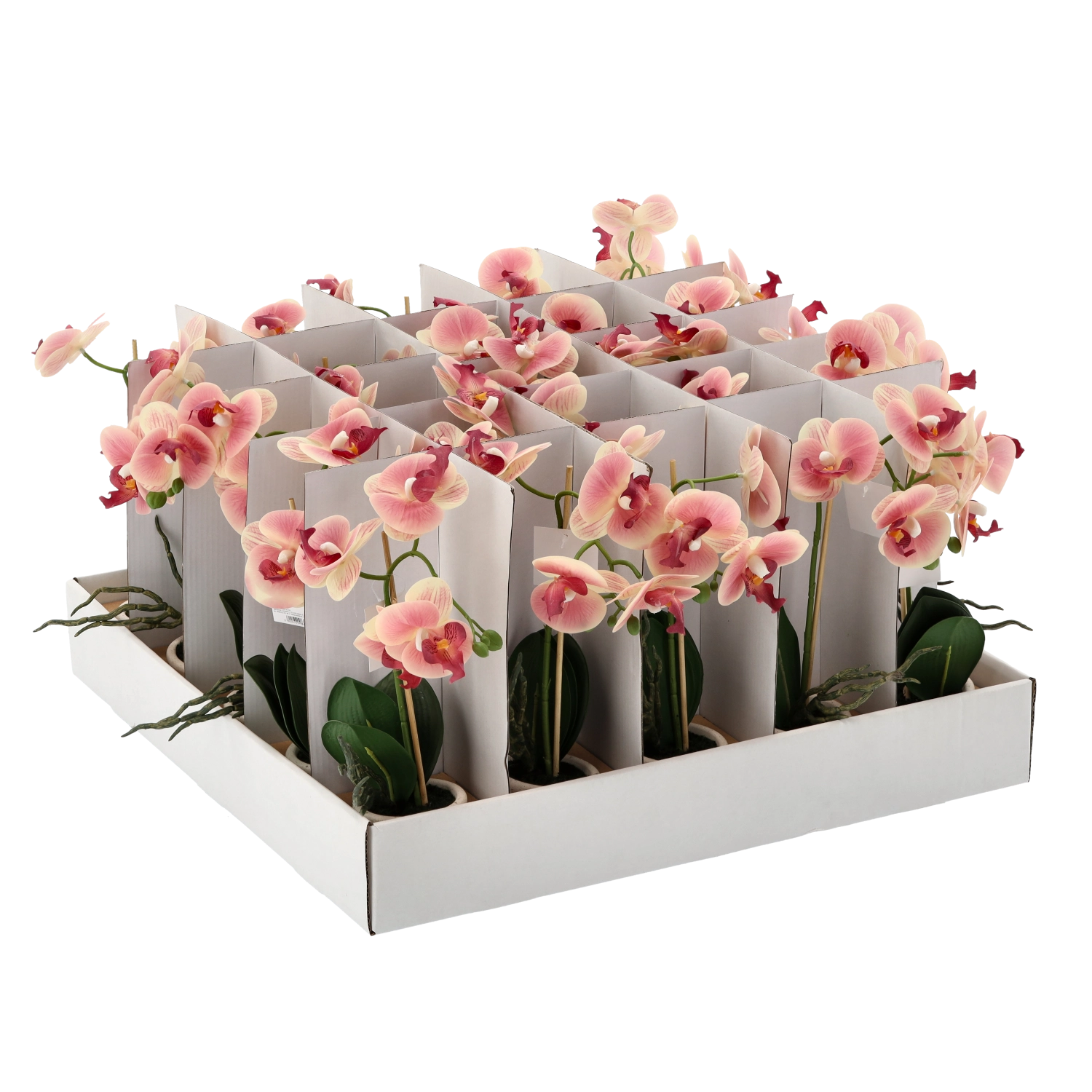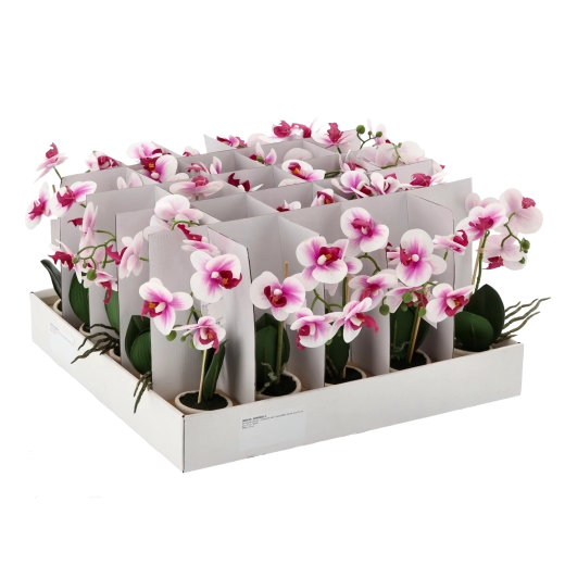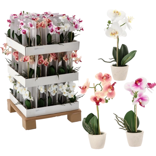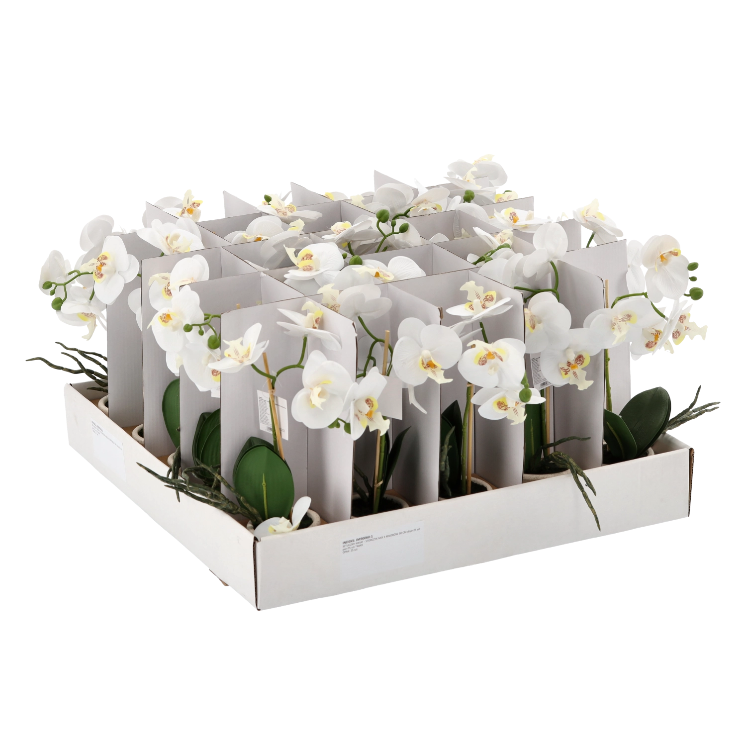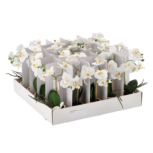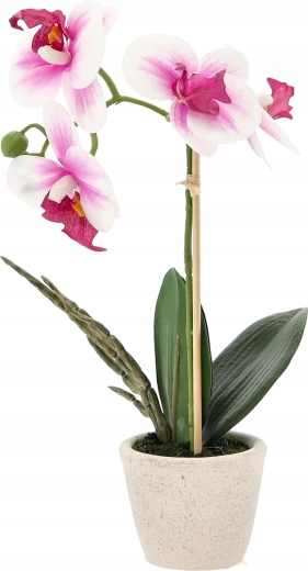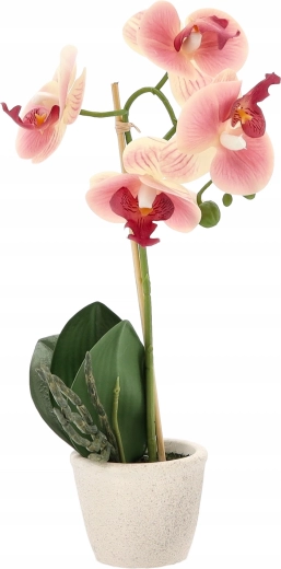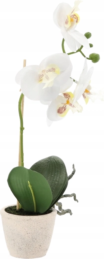 O orhidee artificială în ghiveci elegantă, care aduce prospețime și stil interiorului fără a necesita îngrijire. Datorită florilor și frunzelor realiste, arată ca una vie, este fără întreținere și gata de a fi așezată imediat pe masă, raft sau pervaz. Ideală pentru acasă, la birou și la recepție.