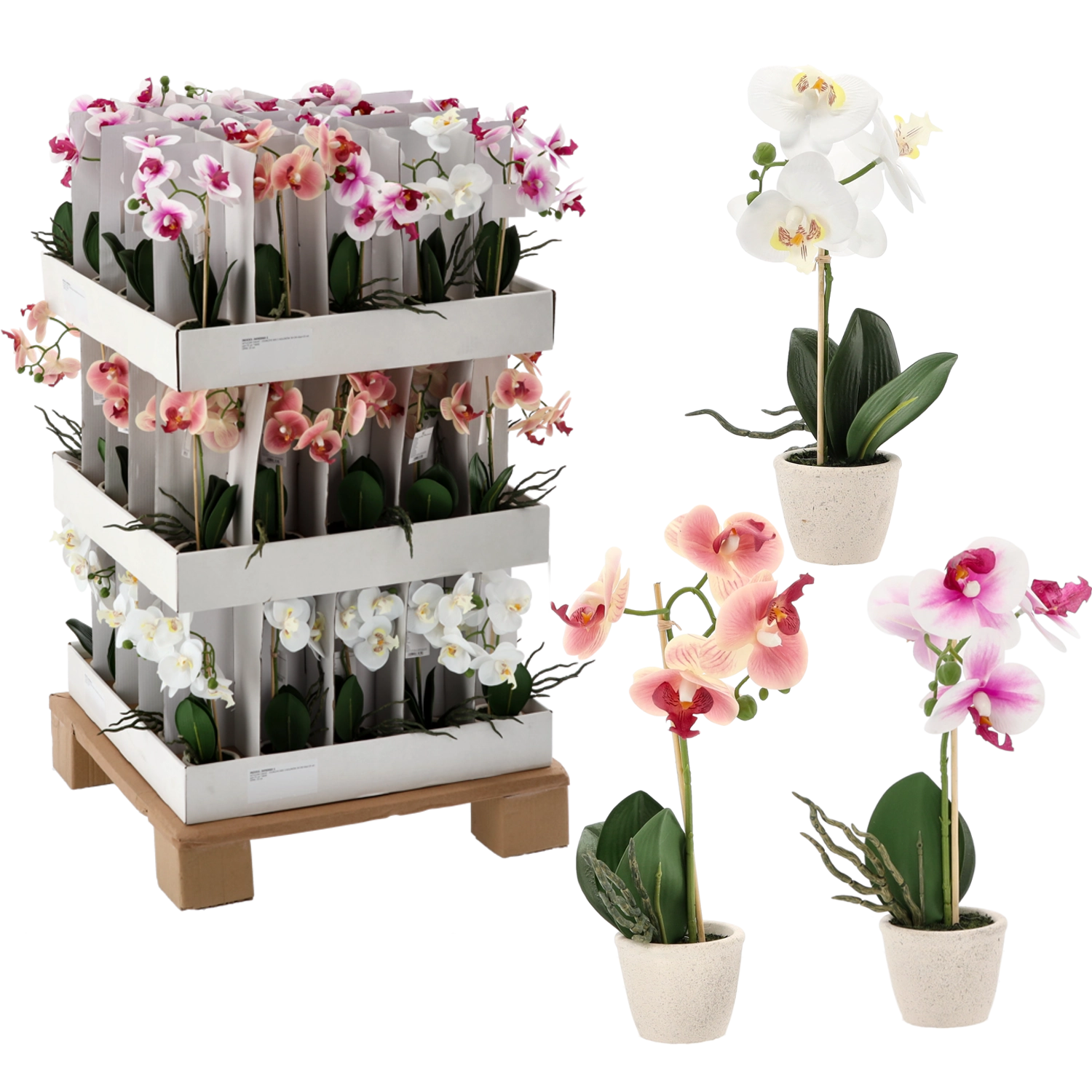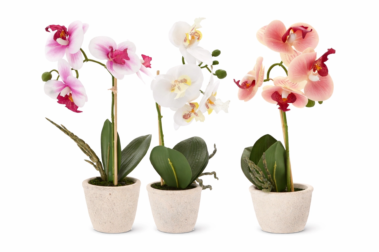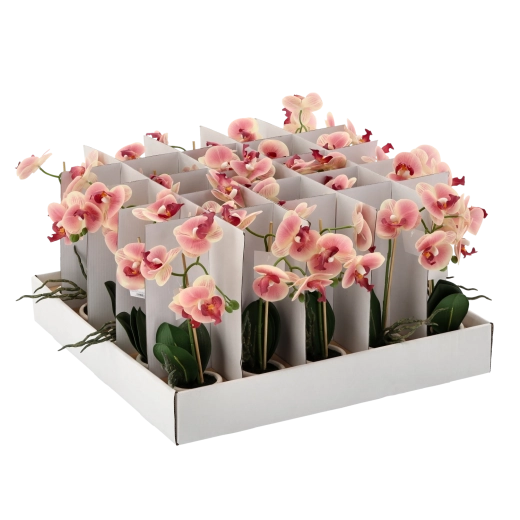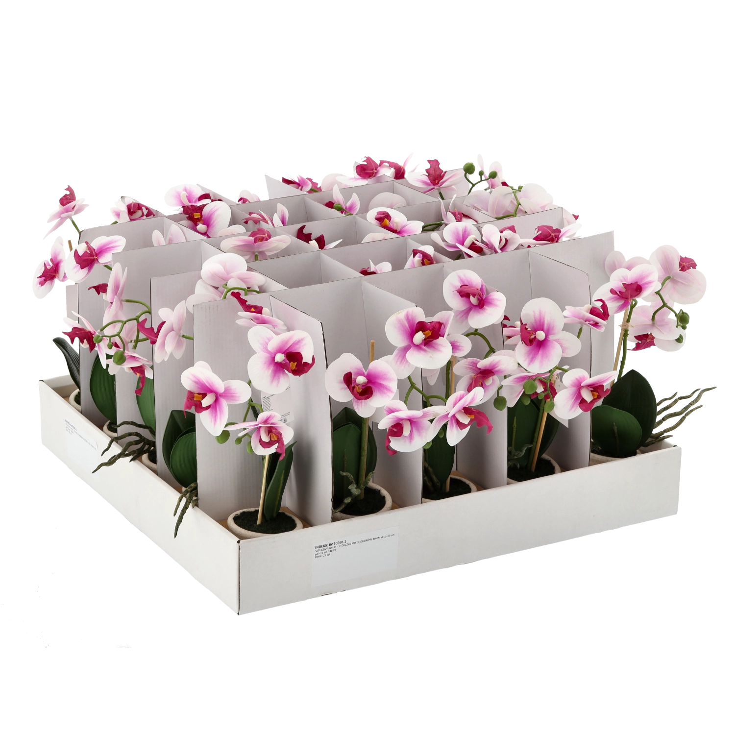 O orhidee artificială în ghiveci elegantă, care aduce prospețime și stil interiorului fără a necesita îngrijire. Datorită florilor și frunzelor realiste, arată ca una vie, este fără întreținere și gata de a fi așezată imediat pe masă, raft sau pervaz. Ideală pentru acasă, la birou și la recepție.