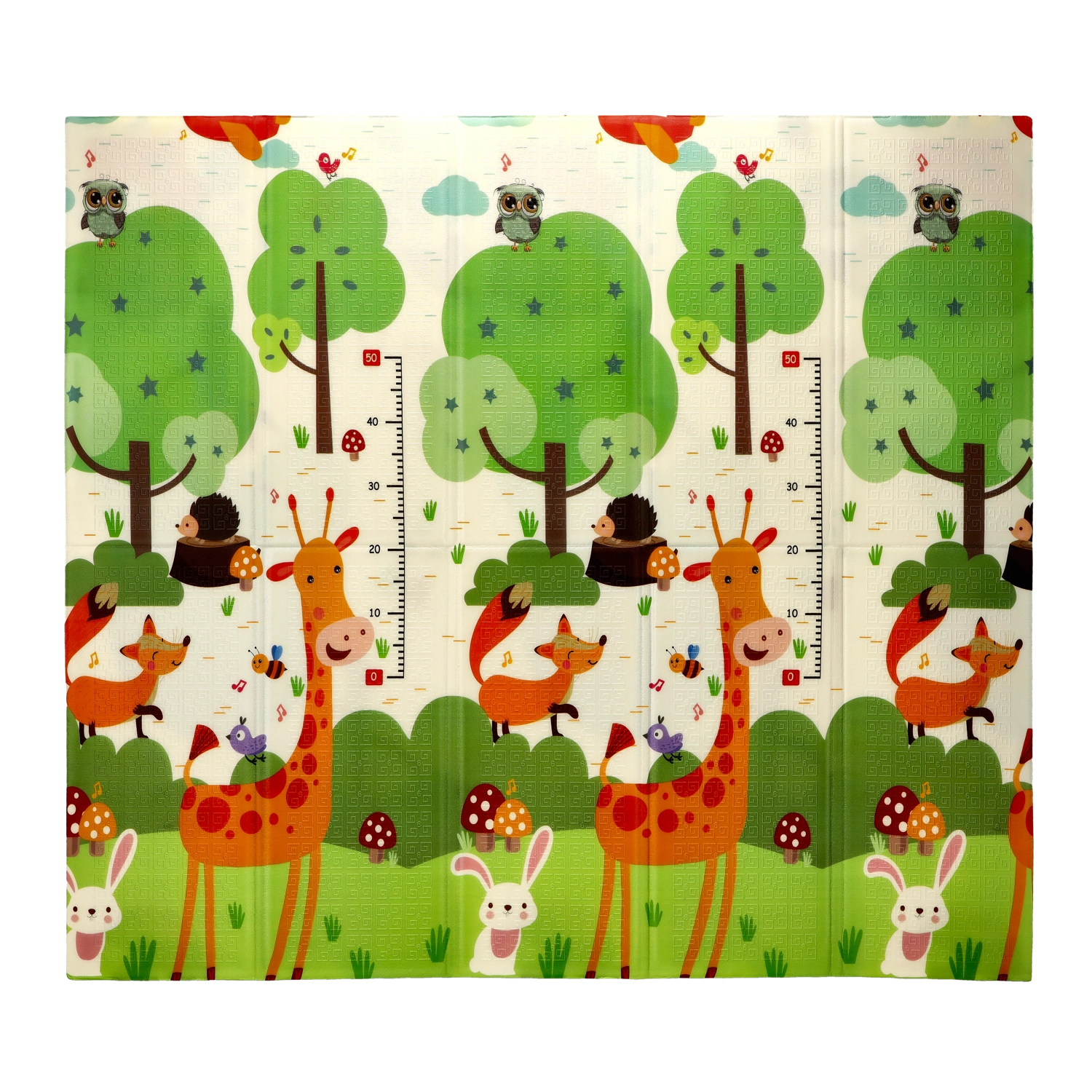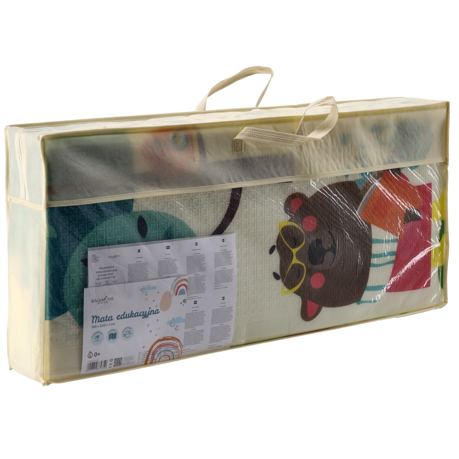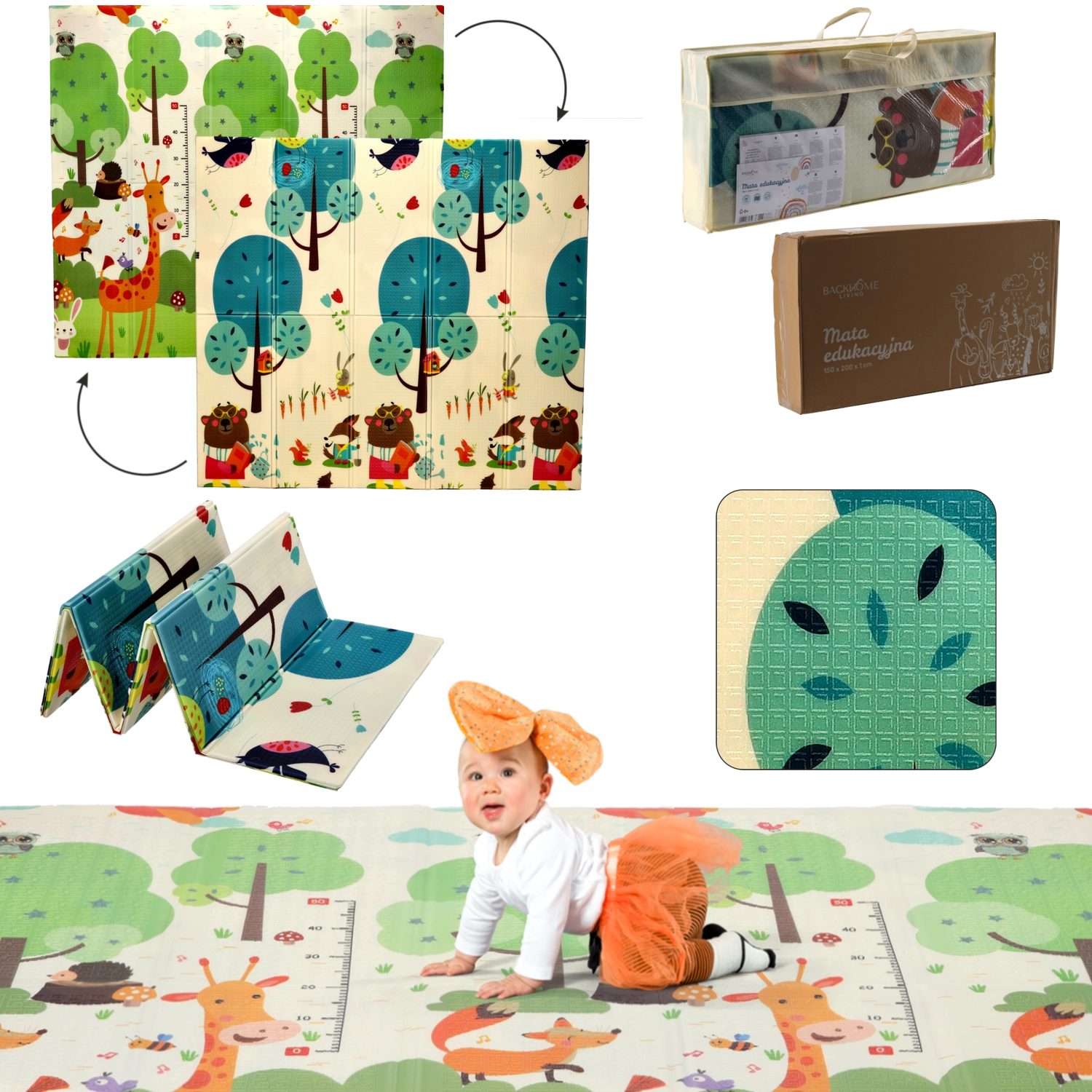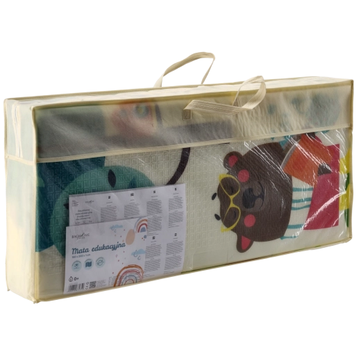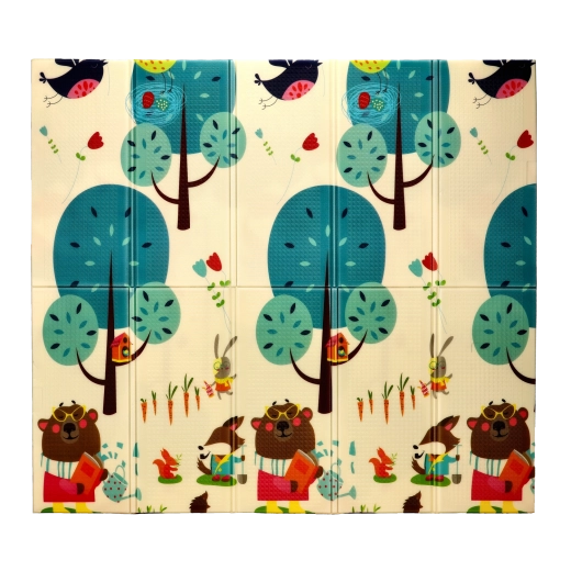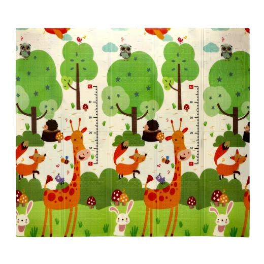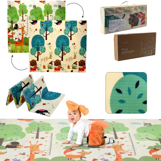Motivurile pe ambele fețe, cu animale și copaci, susțin în mod natural dezvoltarea senzorială, învățarea culorilor și formelor și inspiră activități ludice. Covorașul se curăță ușor, nu absoarbe umezeala și oferă o suprafață stabilă, antiderapantă.