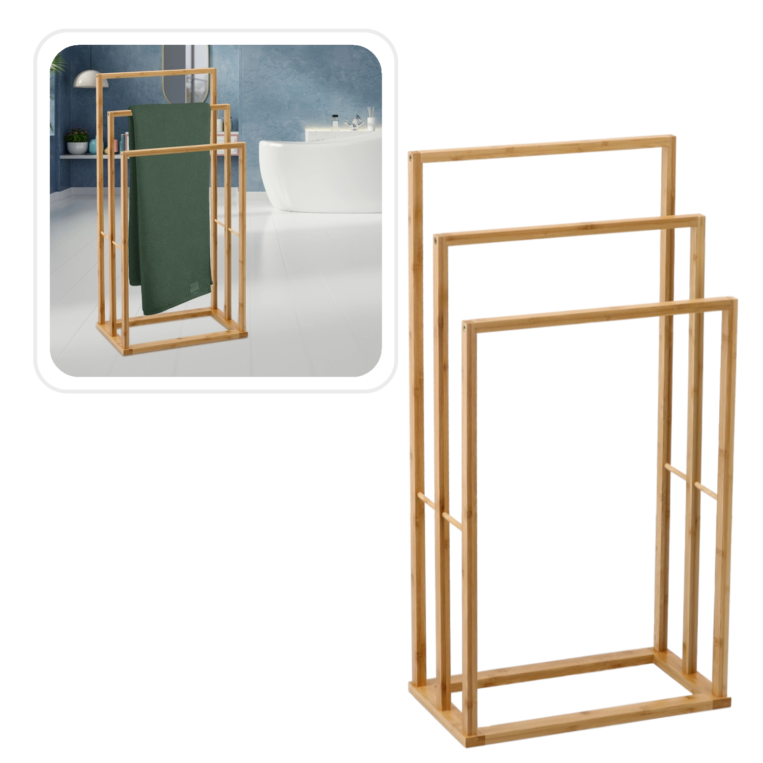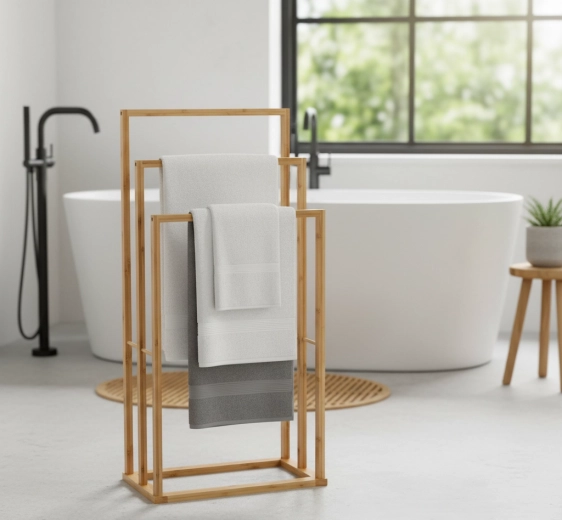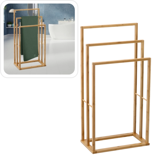 Îmbunătățiți organizarea băii cu un suport stilat pentru prosoape din bambus natural. Trei bare dispuse pe înălțimi diferite oferă suficient spațiu pentru uscarea și depozitarea ordonată a prosoapelor pentru întreaga familie. Designul minimalist și aerisit favorizează circulația aerului și accelerează uscarea.