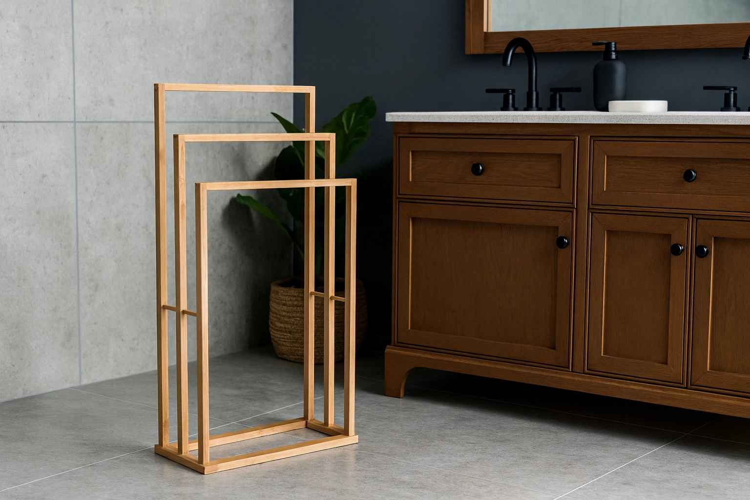 Datorită dimensiunilor compacte de 42 × 24 × 82 cm, suportul încape cu ușurință și în băile mici, iar baza dreptunghiulară solidă asigură o stabilitate excelentă. Bambusul este durabil, ușor și ușor de întreținut – este suficient să fie șters cu o cârpă umedă.