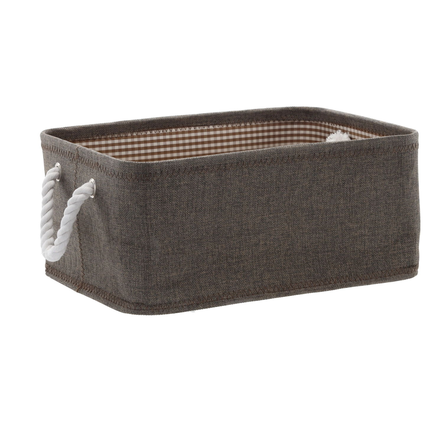 Coșul este realizat din țesătură rezistentă pentru durată de viață îndelungată și întreținere facilă. Mânerele puternice, împletite, din frânghie permit transportul comod, iar căptușeala interioară cu decor oferă un aspect elegant. Pereții moi economisesc spațiu și permit depozitarea facilă pe rafturi sau în dulap.