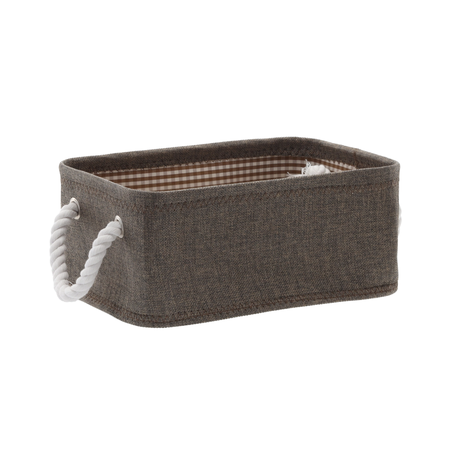 Coșul elegant maro, cu suprafață textilă și căptușeală în carouri, este o soluție bine gândită pentru organizarea de zi cu zi. Datorită dimensiunilor medii, se potrivește ușor pe rafturi, în dulapuri și pe etajere deschise, unde servește atât ca accesoriu stilat, cât și ca spațiu practic de depozitare.