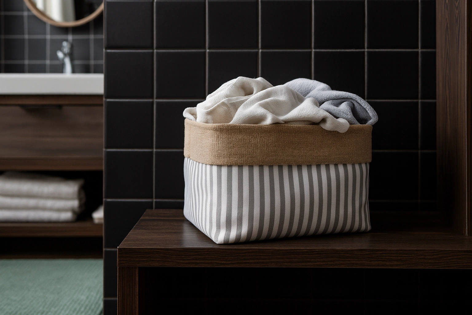 Modelul cu dungi atemporal și liniile curate fac din acest coș un element practic și decorativ pentru living, dormitor și baie.