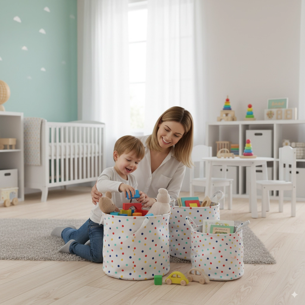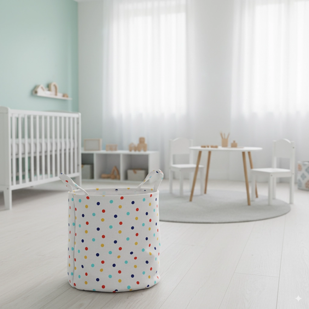 Acest coș textil rotund, cu buline colorate, este un ajutor universal pentru baie, camera copilului și dormitor. Oferă spațiu suficient pentru depozitarea rufelor, jucăriilor sau mărunțișurilor din casă și, în același timp, aduce încăperii un aspect proaspăt și vesel.