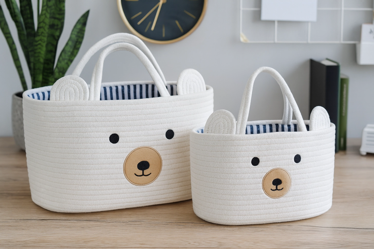 Căutați o soluție de depozitare stilată și funcțională pentru jucării, haine sau mărunțișuri? Acest coș alb cu un simpatic motiv de ursuleț îmbină spațiu practic de depozitare cu design decorativ. Datorită celor două mânere rezistente, se transportă ușor între încăperi, iar pereții săi structurați își mențin forma.