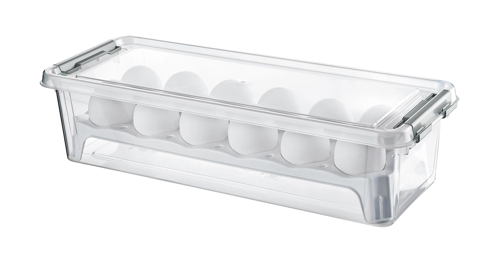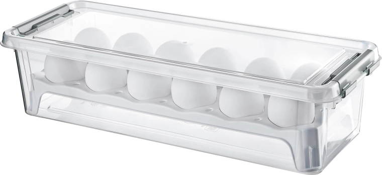 Cutia practică dreptunghiulară pentru până la 12 ouă este fabricată din plastic de calitate, fără BPA nociv. Datorită deschiderii ușoare, construcției rezistente și posibilității de depozitare în frigider și congelator, este ideală pentru utilizarea zilnică și transportul sigur al ouălor. Se poate spăla în mașina de spălat vase.