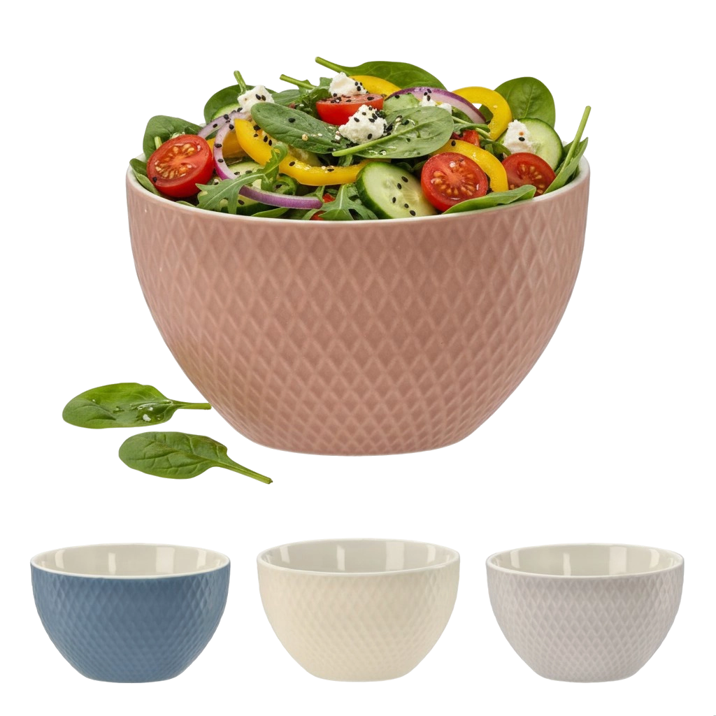 Suprafața în relief sporește atât estetica, cât și funcționalitatea – bolul se ține mai bine și nu alunecă din mână la servirea supelor, salatelor sau deserturilor.