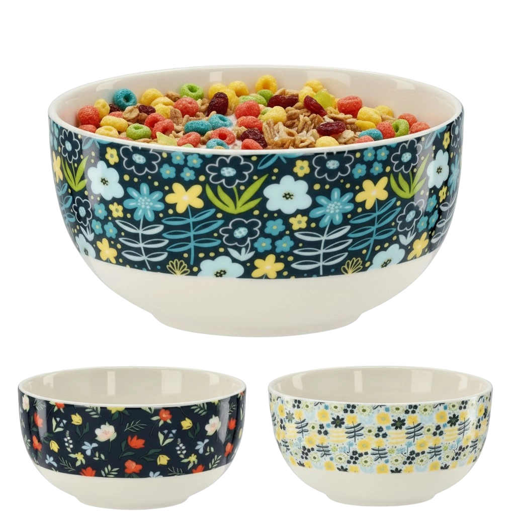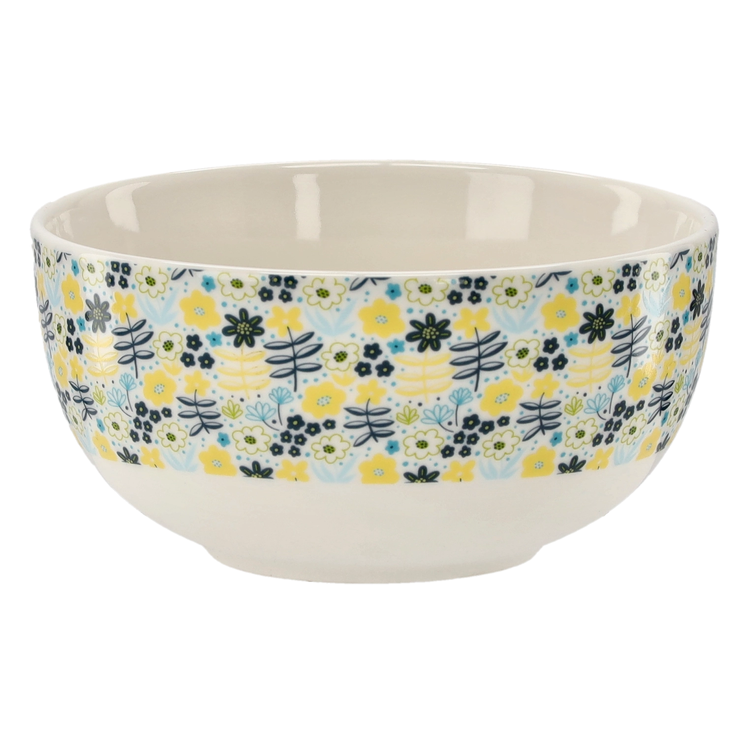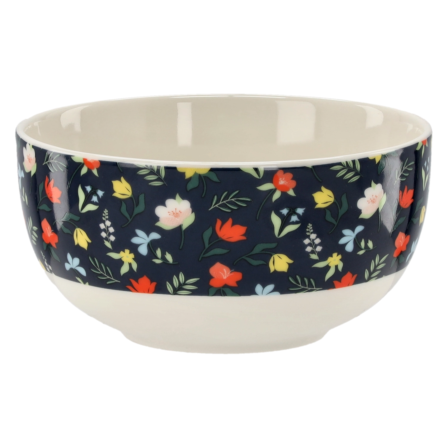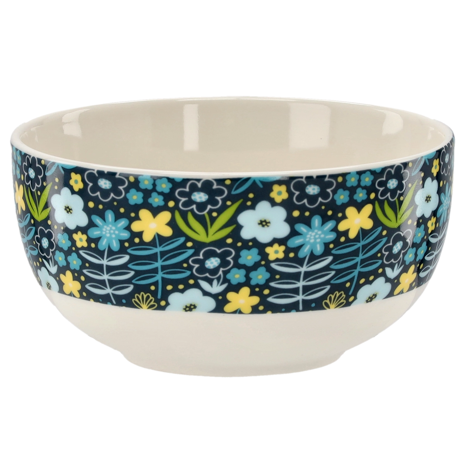 Adaugă farmec mesei tale cu bolul din porțelan cu motiv floral. Suprafața lucioasă, interiorul alb și banda decorativă lată cu flori colorate oferă un aspect proaspăt și atemporal. Volumul de 550 ml este ideal pentru cerealele de dimineață, supe, salate și garnituri în porții mai mici.