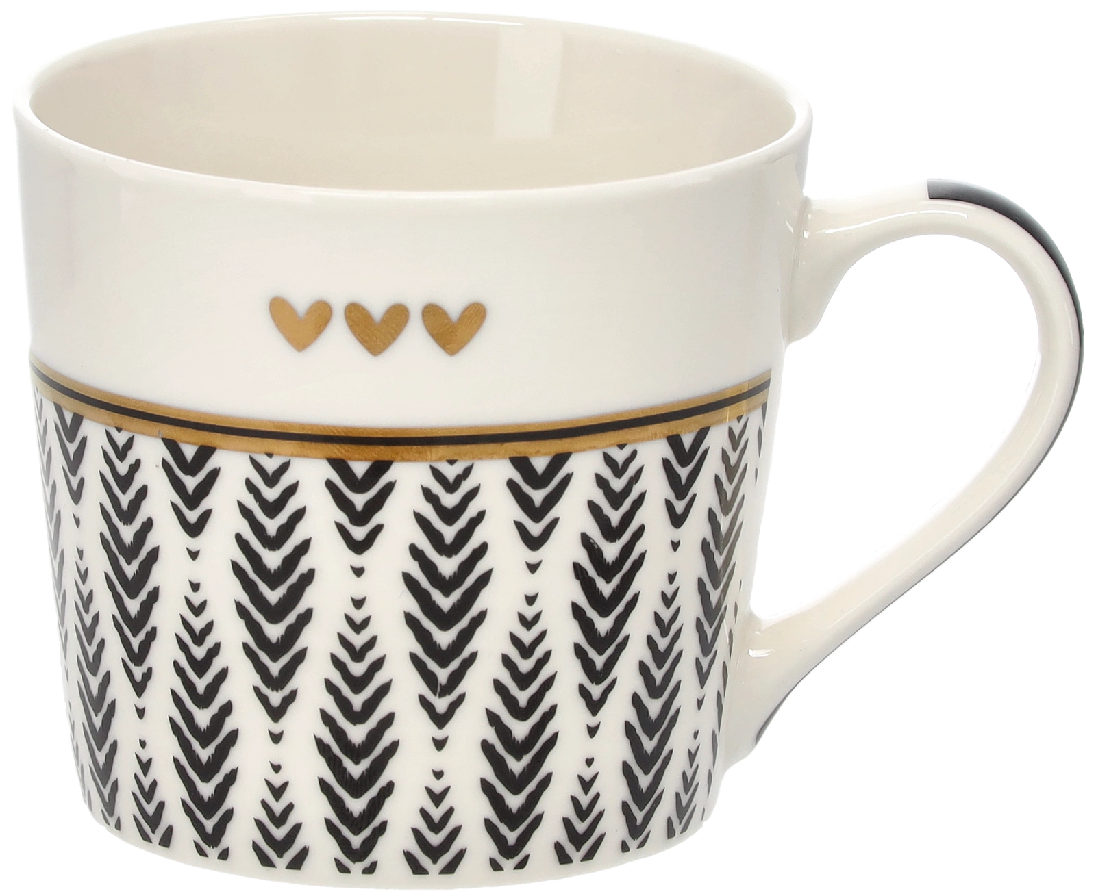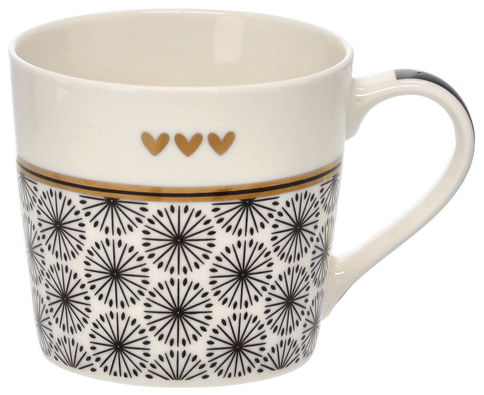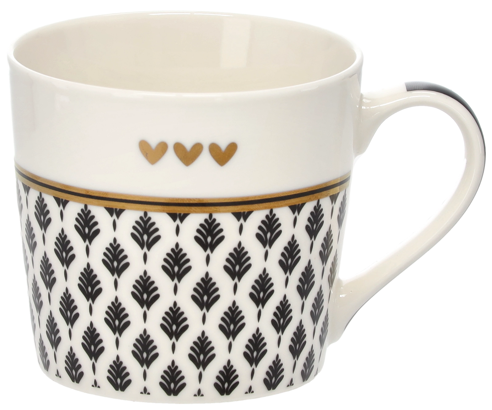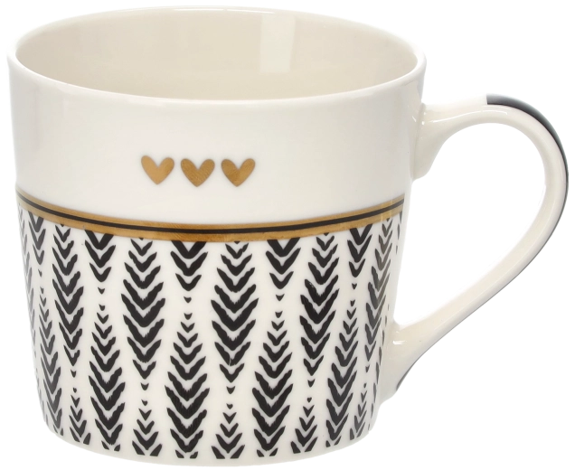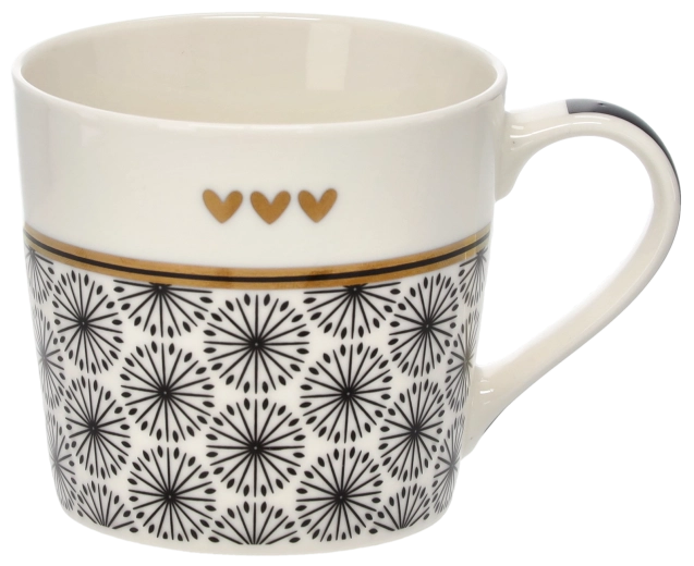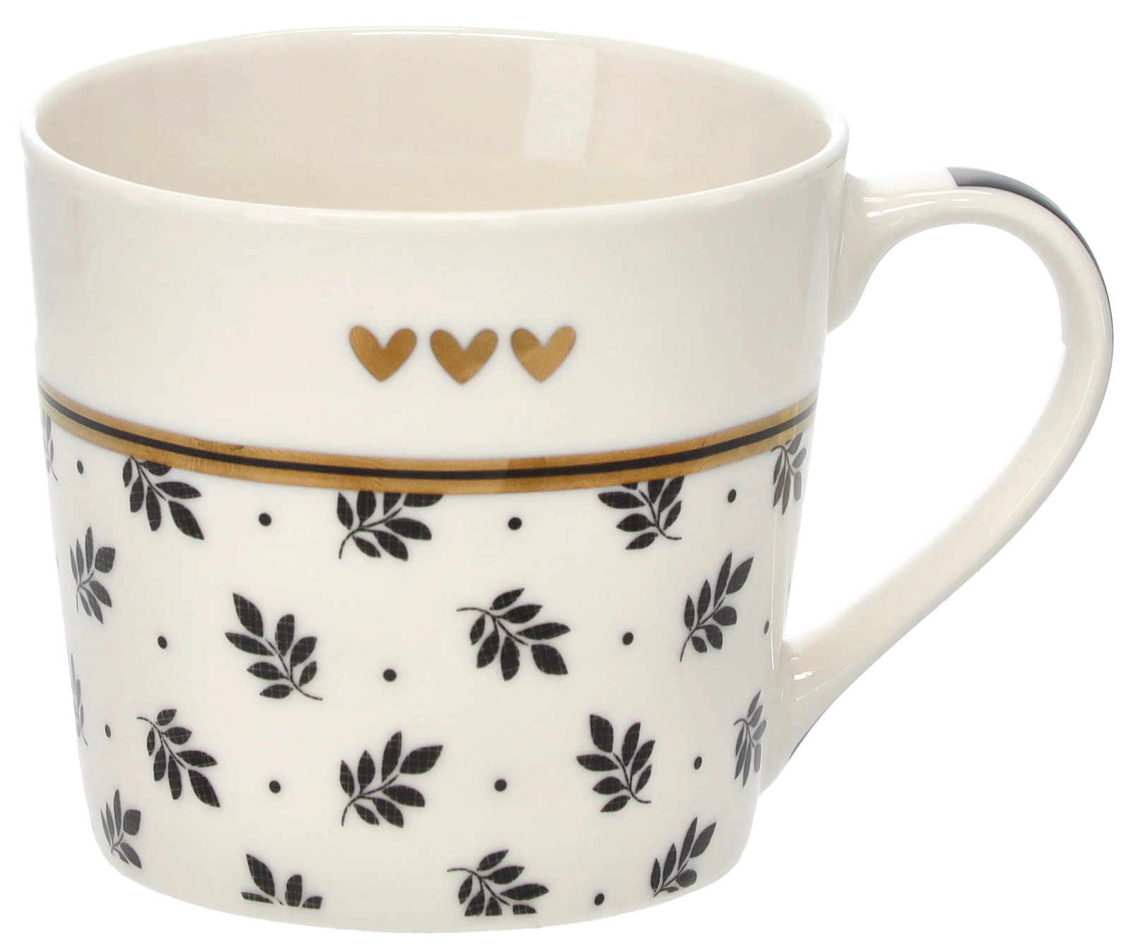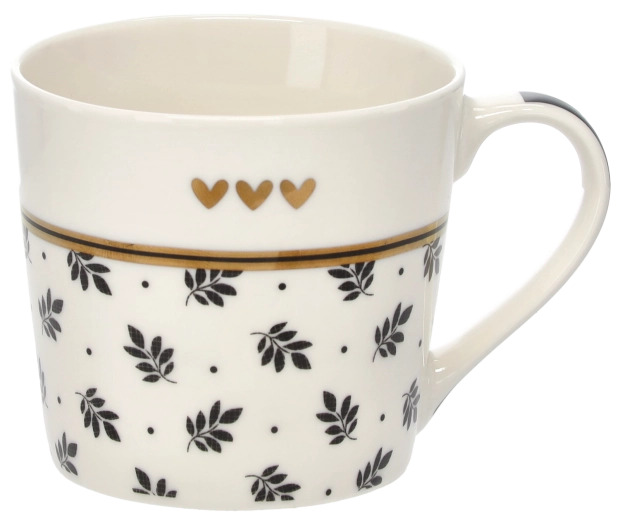 Motivul delicat de crenguțe, completat de trei inimioare mici și o dungă aurie, oferă cănii un aspect sofisticat care iese în evidență pe orice masă.