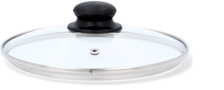 Capac universal din sticlă cu diametrul de 20 cm, realizat din sticlă securizată rezistentă, ideal pentru gătitul zilnic. Oferă rezistență termică, orificiu practic pentru abur pentru evacuarea aburului în exces și mâner din plastic solid pentru manipulare sigură. Marginea interioară din inox previne scurgerea condensului în afara vasului.