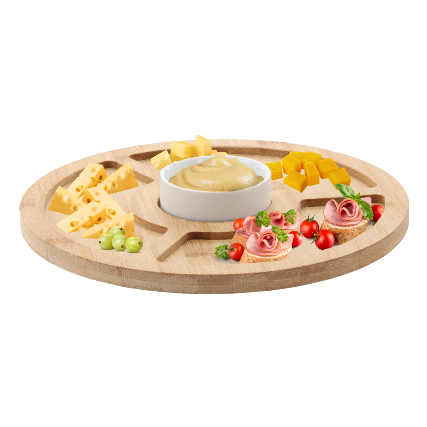Această tavă rotundă de servire din bambus, cu bol din porțelan, este o soluție excelentă pentru gustări acasă și evenimente. Datorită celor patru secțiuni separate, fiecare tip de gustare rămâne la locul său, în timp ce bolul central din porțelan este ideal pentru dipuri și sosuri.