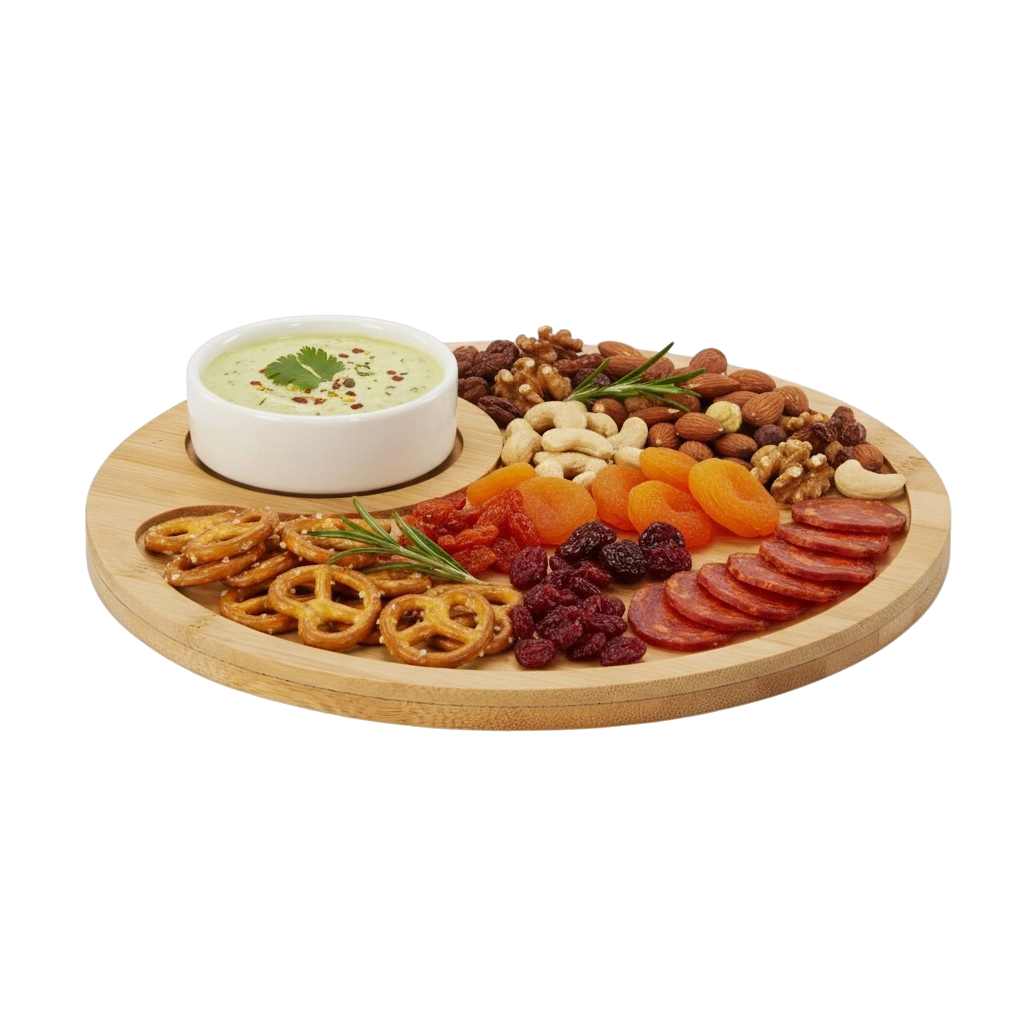 Tava cu bol se potrivește pentru diverse gustări – de la brânzeturi și mezeluri la nachos, nuci și dipuri. Creează cu ușurință un platou de aperitive atrăgător.