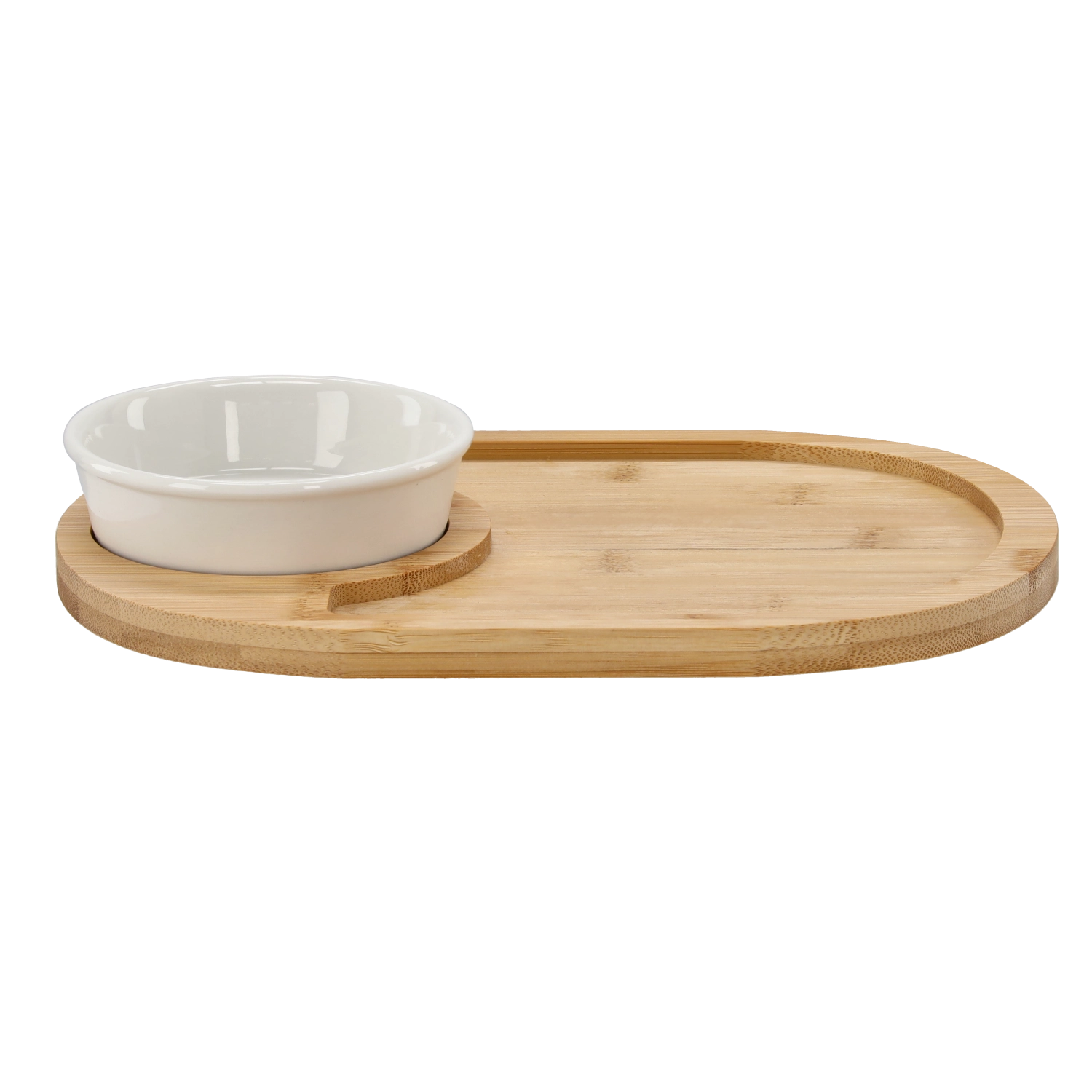 Acest set universal pentru servirea aperitivelor impresionează prin aspectul natural modern și execuția funcțională. Tava ovală din bambus, cu spațiu dedicat pentru bolul din porțelan, permite aranjarea clară a brânzeturilor, mezelurilor, măslinelor sau pâinii, servind totodată sosuri, dipuri sau pesto. Datorită dimensiunilor de 28 × 21 × 4 cm, oferă suficient loc pentru gustări variate.