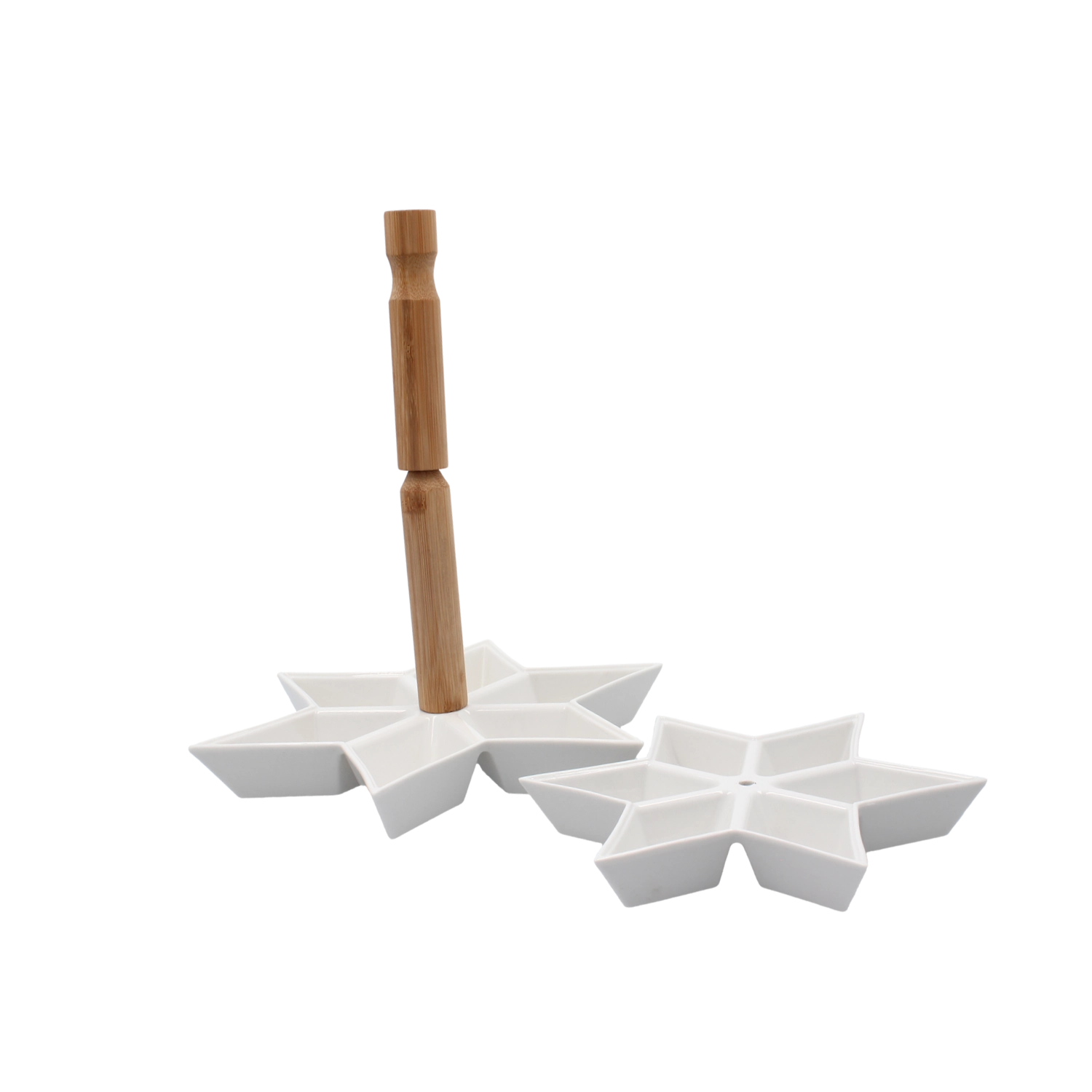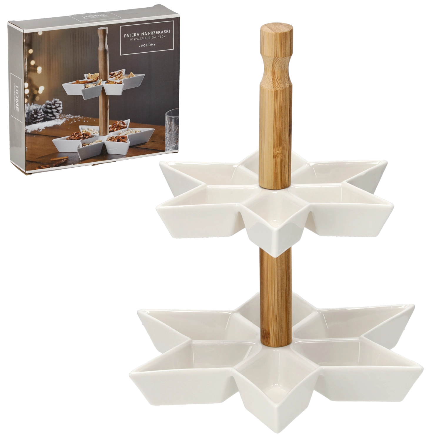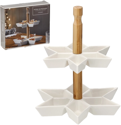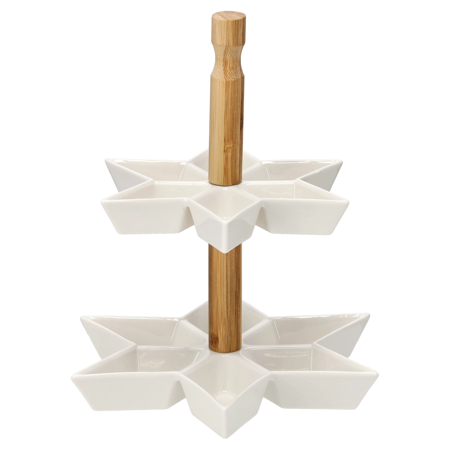 Creați o prezentare impresionantă a gustărilor cu această etajeră cu două niveluri în formă de stea. Ceramica albă, cu suprafață netedă, este curată și elegantă, în timp ce mânerul din bambus asigură un transport sigur și confortabil. Datorită celor două trepte, separați ușor diferitele tipuri de delicatese și, în același timp, economisiți spațiul prețios de pe masă.