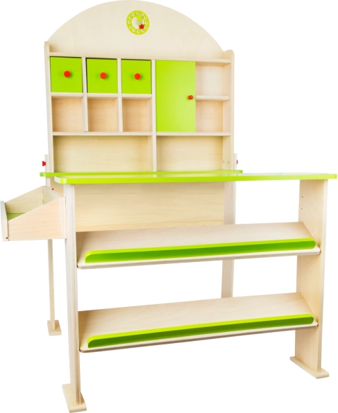 Un stand de vânzare modern din lemn nu numai că dezvoltă abilitățile de comunicare și matematice ale copiilor, dar le și stimulează creativitatea. Este echipat cu spații de depozitare, care includ rafturi înclinate pentru depozitarea cutiilor și rafturi separate pentru articole și mărfuri. Peretele din spate conține suprafețe de depozitare și dulapuri cu uși funcționale. În partea de sus a standului sunt ceasuri pe care copiii le pot folosi pentru a învăța ora și pentru a marca orele de deschidere.