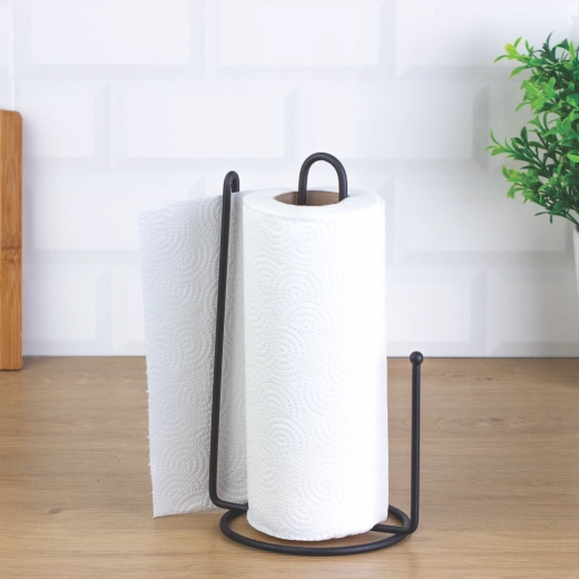 Elegantul suport metalic pentru prosoape de hârtie, în culoare negru mat, cu detaliu din bambus, îmbină durabilitatea, stabilitatea și stilul industrial modern. Datorită bazei circulare stabile și construcției bine gândite, permite ruperea ușoară cu o singură mână și găzduiește fără probleme role standard de prosoape de hârtie.