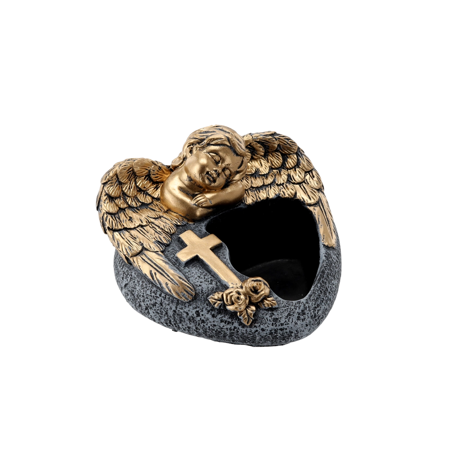 Ghiveci elegant în formă de inimă, cu motiv de înger, aduce aranjamentelor funerare demnitate și simbolul amintirii. Este realizat din ciment rezistent, în culoare gri închis cu detalii aurii, evidențiind frumos compozițiile florale și decorațiunile. Dimensiunea practică permite plantarea ușoară a florilor de sezon; ghiveciul nu are orificiu de scurgere.