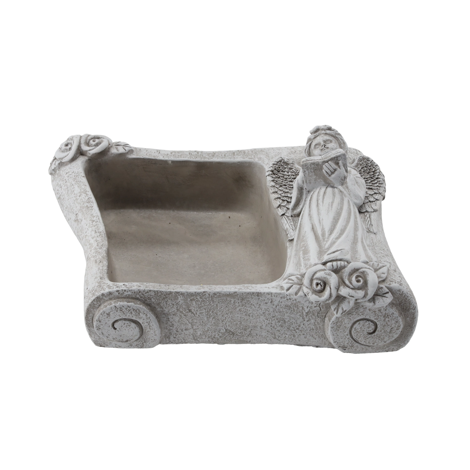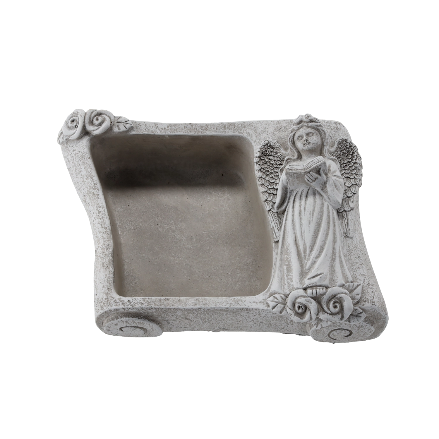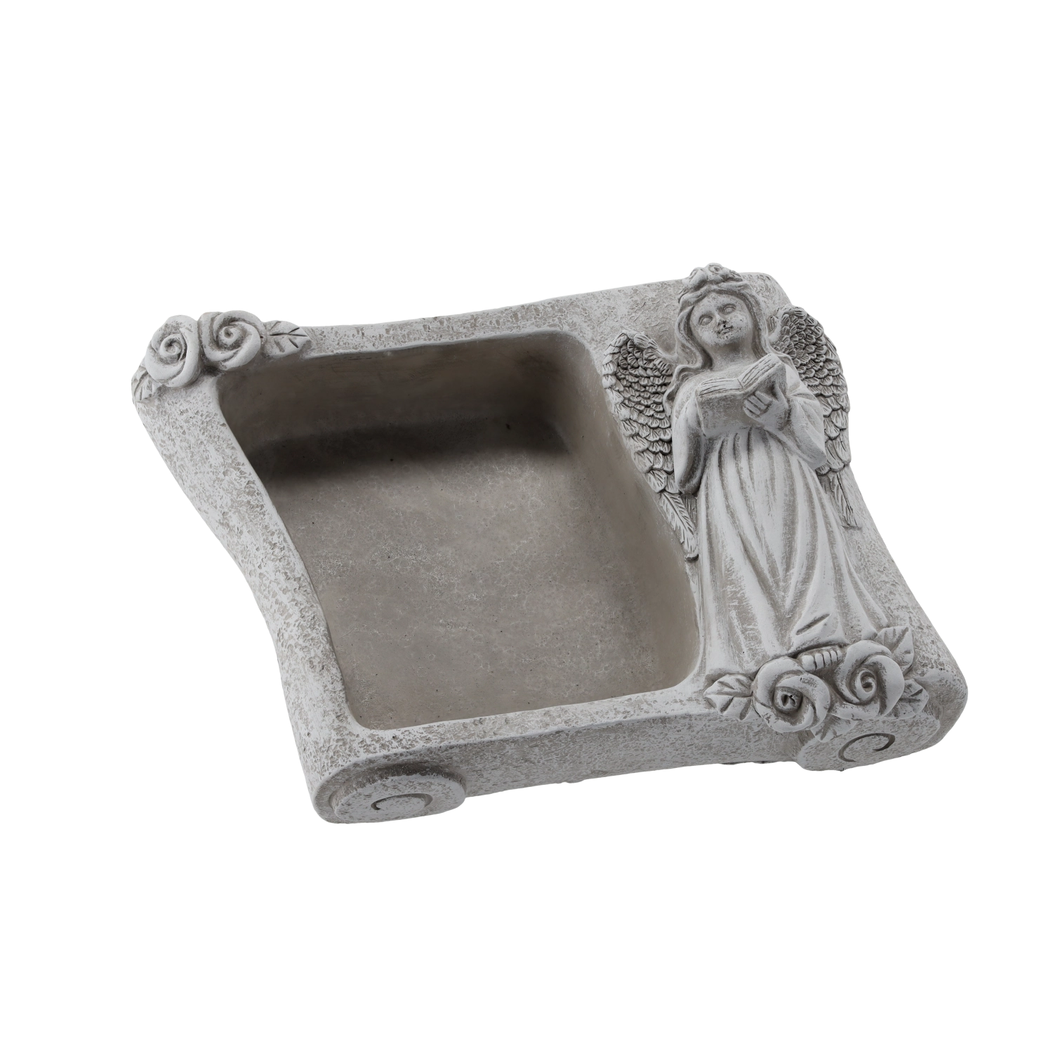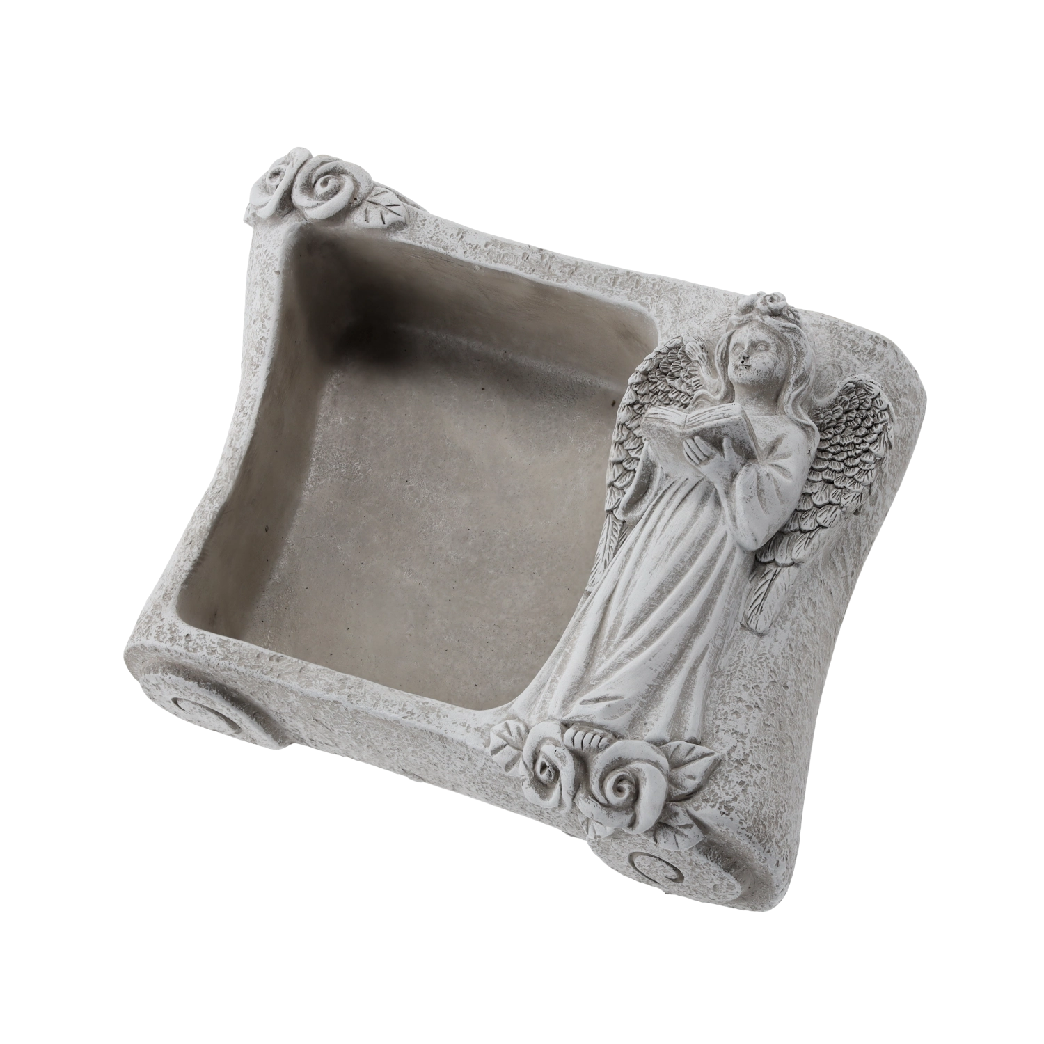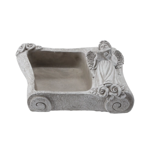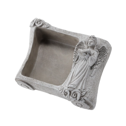 Această cupă decorativă pentru flori, în formă de carte, atrage atenția prin figurina de înger cu carte deschisă și trandafiri în relief la colțuri. Datorită cimentului rezistent și texturii de piatră, este potrivită atât pentru exterior, cât și pentru interior – pentru decorațiuni de cimitir, în hol sau ca accesoriu stilat în living.