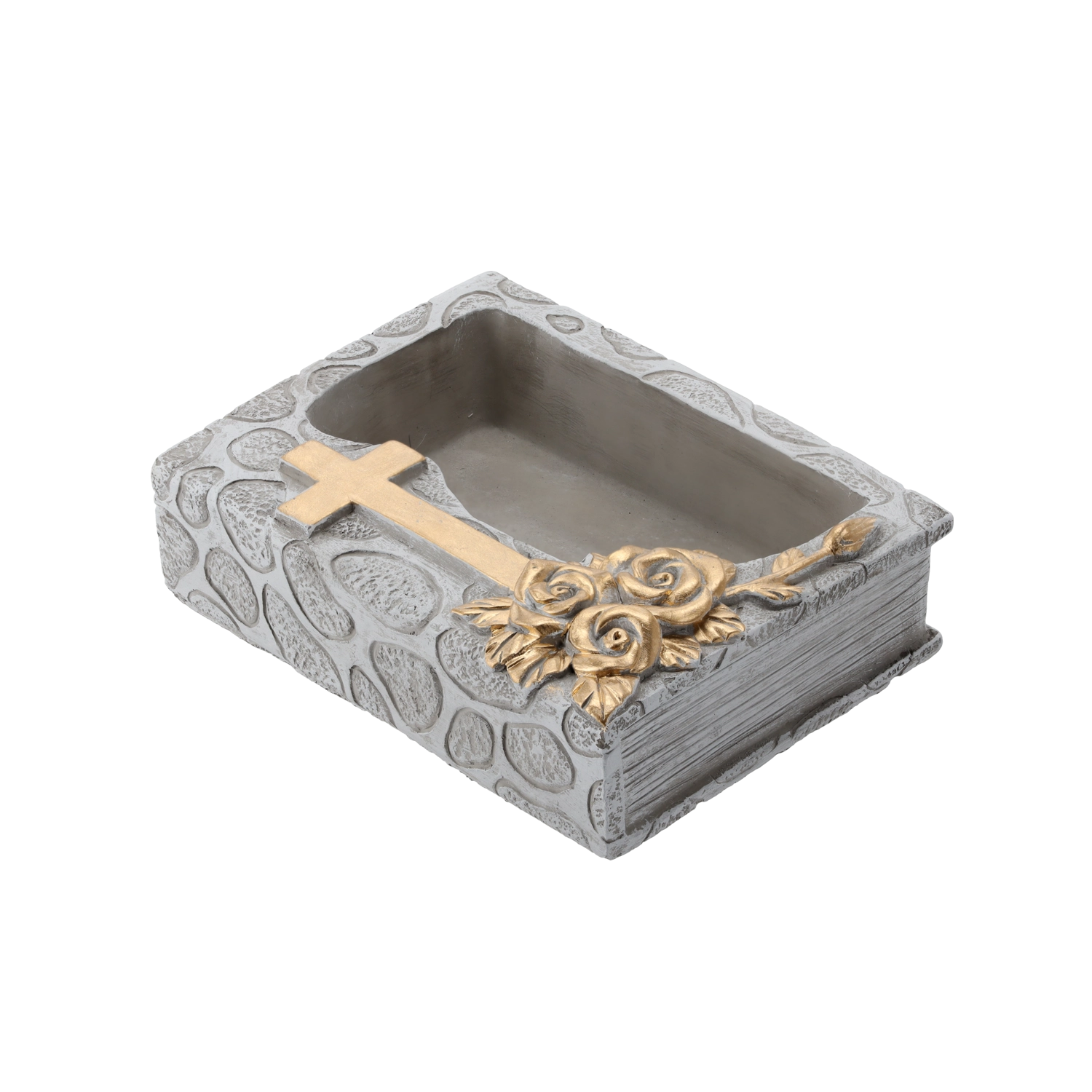 Ghiveci funerar elegant în formă de carte închisă, decorat cu o cruce. Fabricat din ciment durabil, în culoare gri cu detalii aurii care oferă compozițiilor de pe mormânt demnitate și stil. Construcție solidă, design elegant gri-auriu și bază ideală pentru aranjamente florale.