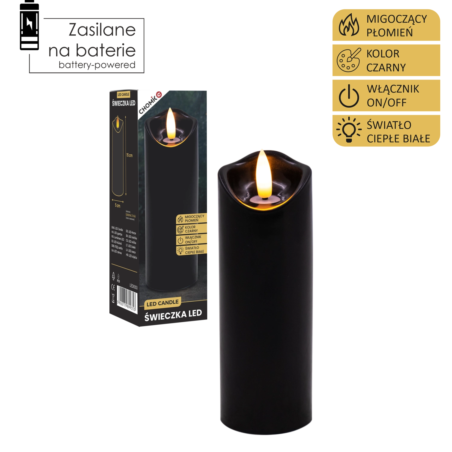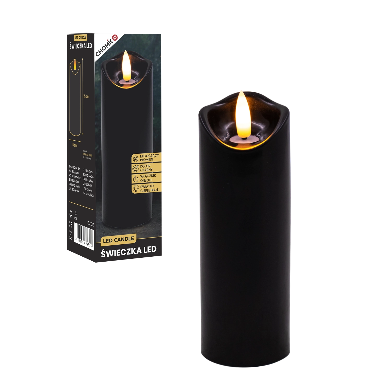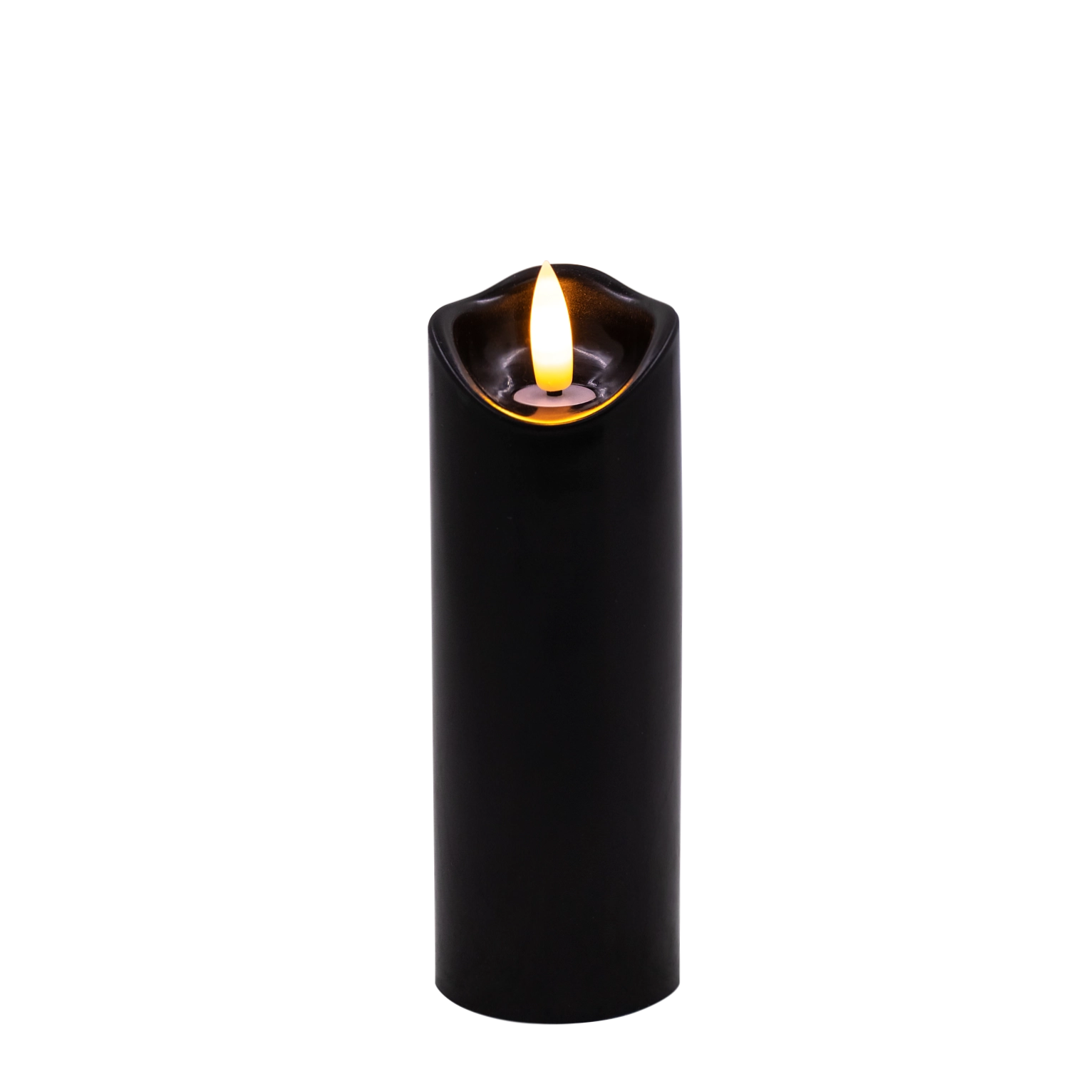 Lumânare LED stilată, în variantă neagră, cu o lumină albă caldă realistă, ușor pâlpâitoare. Potrivită excelent ca decorațiune de interior și ca lumânare introdusă în lanternă sau sfeșnic. Alimentare practică cu 2× baterii AA (nu sunt incluse) și comandă On/Off simplă.