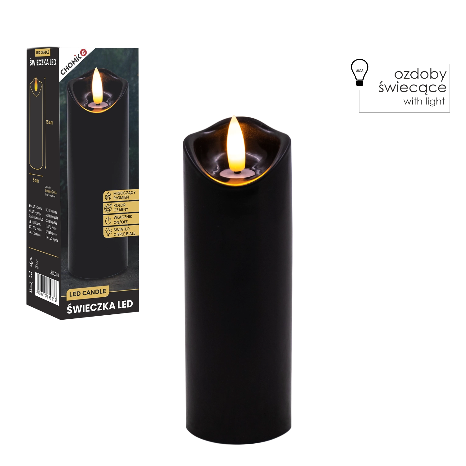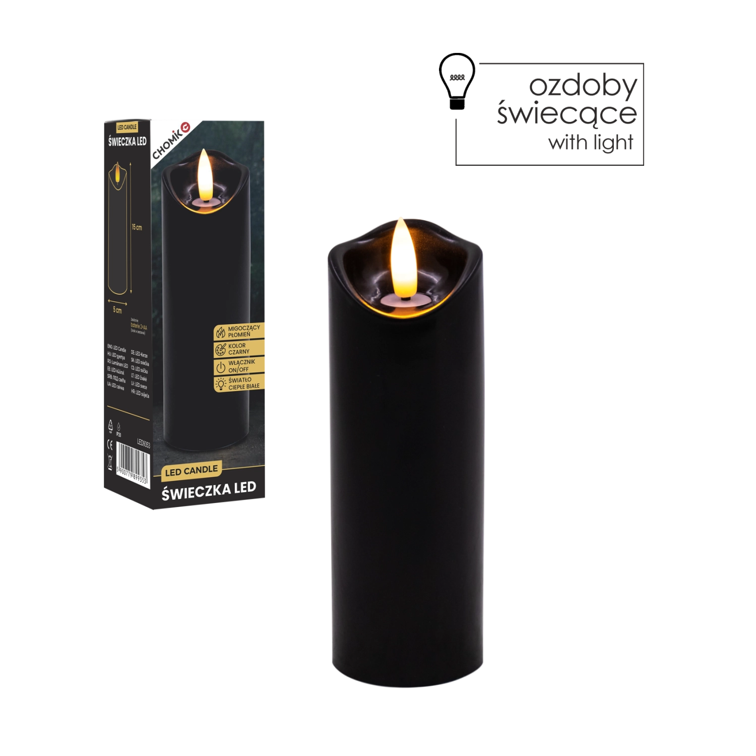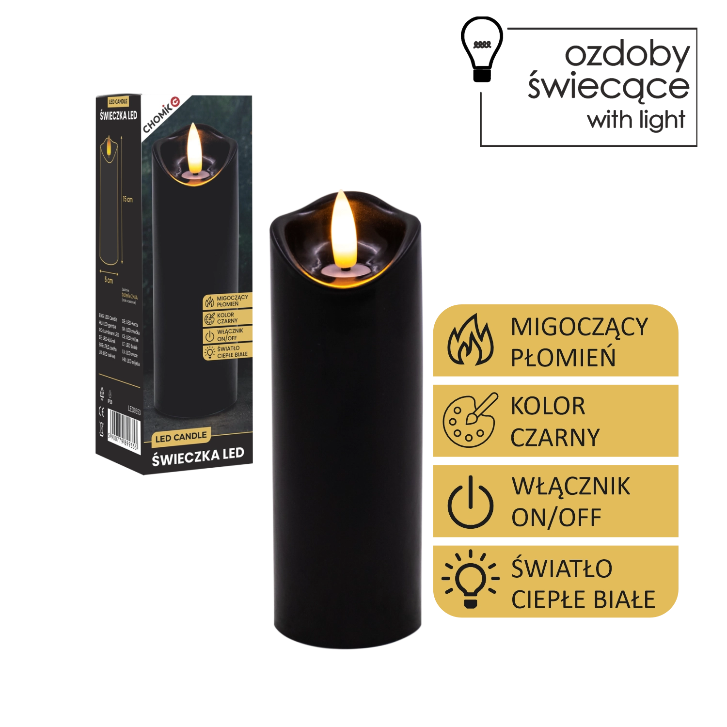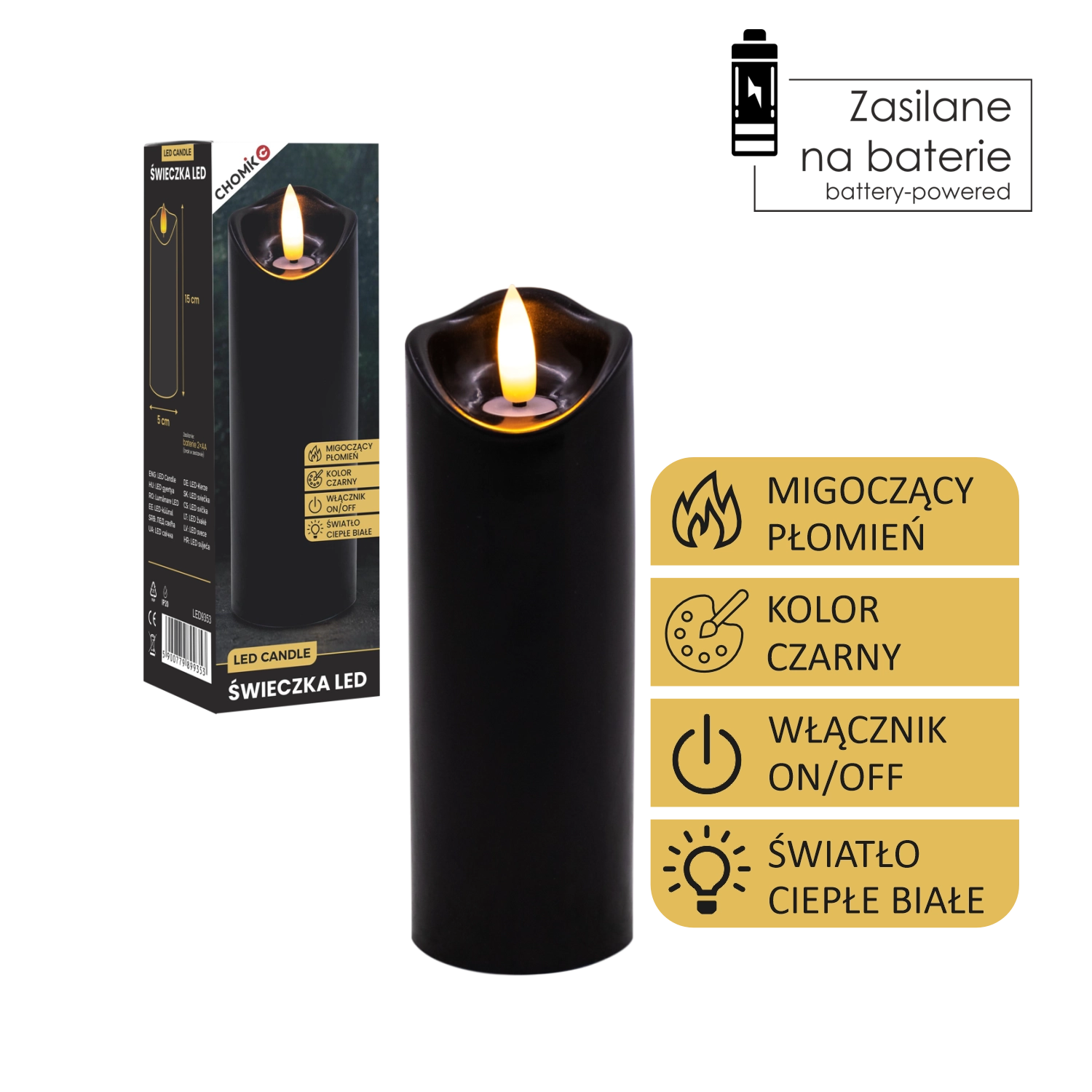 Lumânare LED stilată, în variantă neagră, cu o lumină albă caldă realistă, ușor pâlpâitoare. Potrivită excelent ca decorațiune de interior și ca lumânare introdusă în lanternă sau sfeșnic. Alimentare practică cu 2× baterii AA (nu sunt incluse) și comandă On/Off simplă.