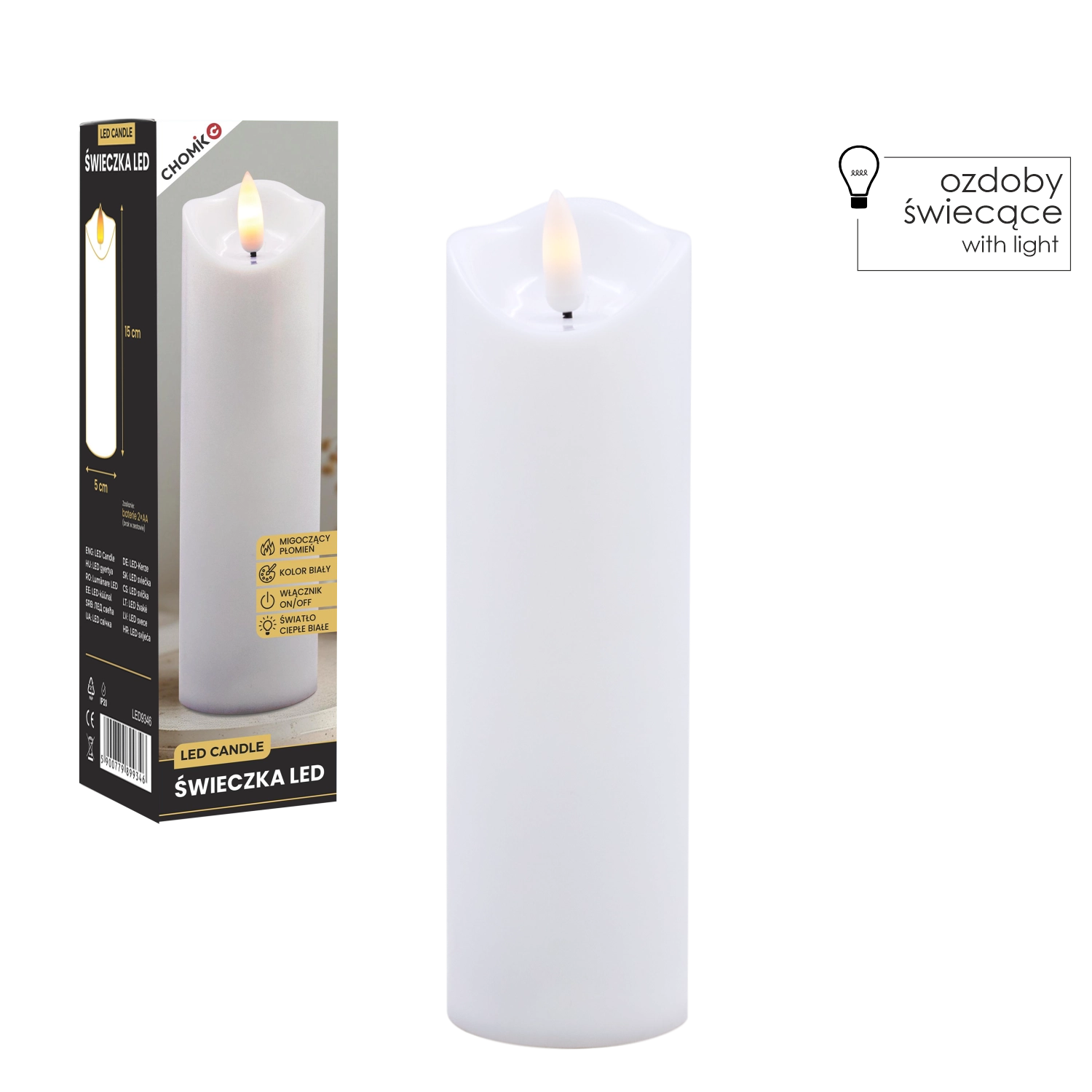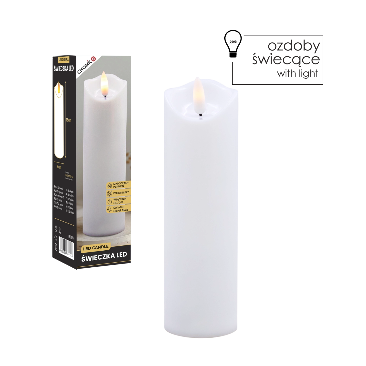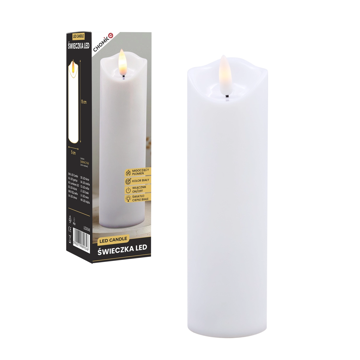 Această lumânare LED realistă, în culoare albă, oferă efectul unei lumini calde care pâlpâie delicat, imitând fidel flacăra fără riscul focului deschis. Este ideală pentru decorul casei, mese festive, seri de relaxare sau ca alternativă sigură în locuințe cu copii și animale de companie.