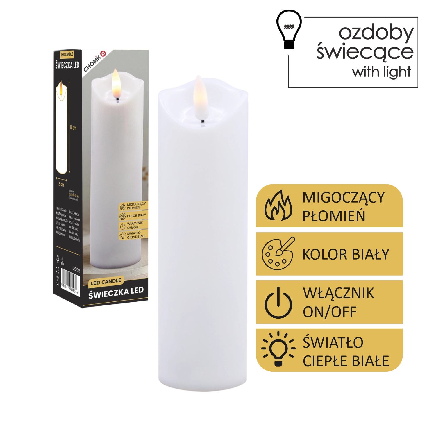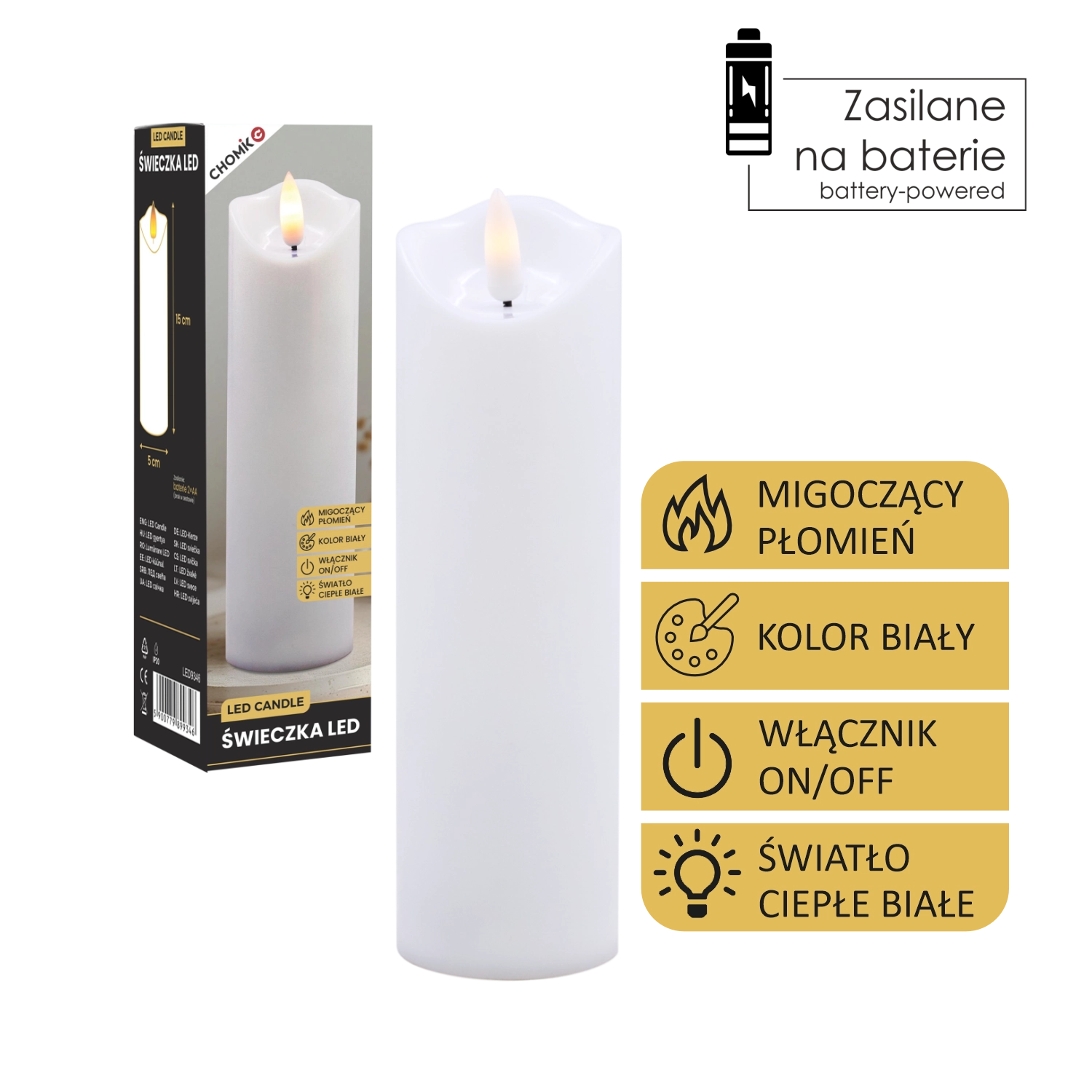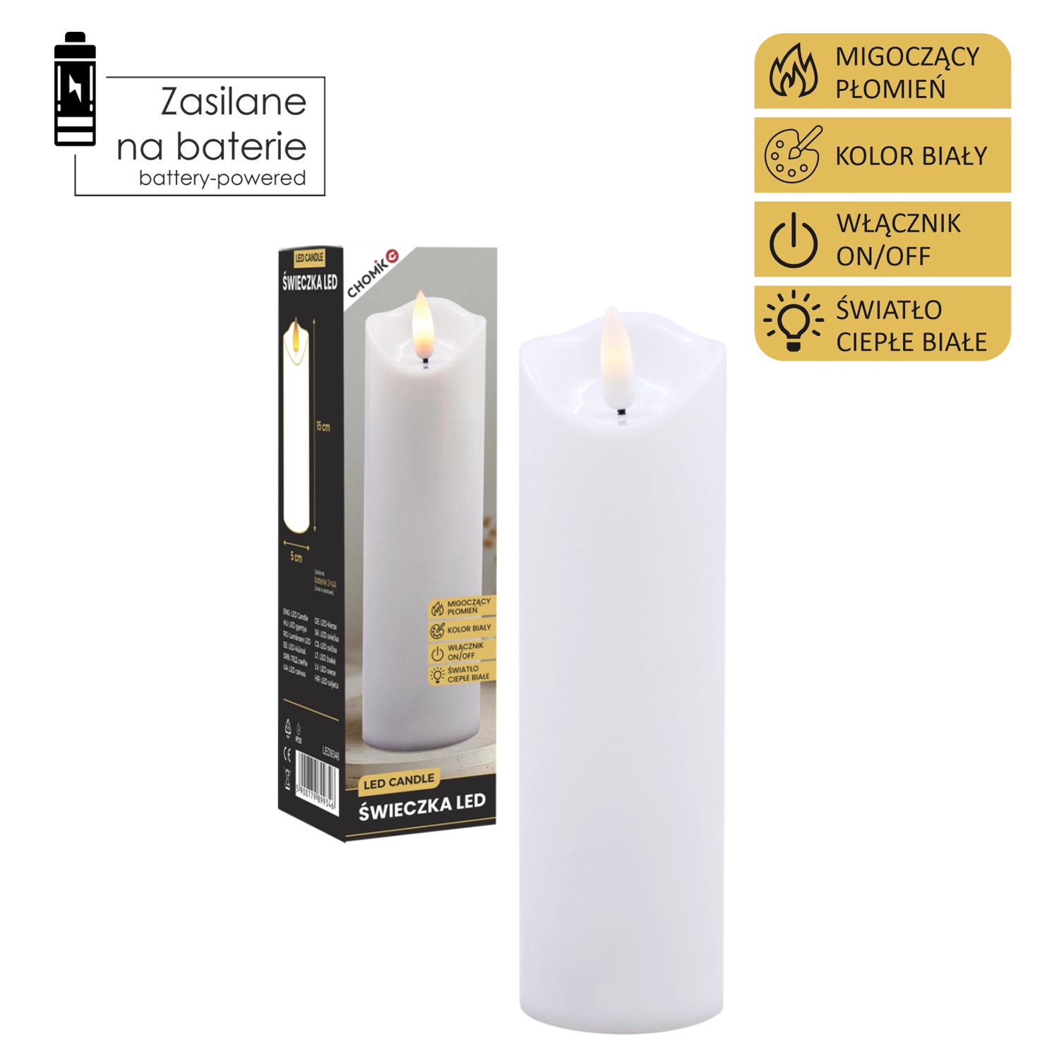 Această lumânare LED realistă, în culoare albă, oferă efectul unei lumini calde care pâlpâie delicat, imitând fidel flacăra fără riscul focului deschis. Este ideală pentru decorul casei, mese festive, seri de relaxare sau ca alternativă sigură în locuințe cu copii și animale de companie.